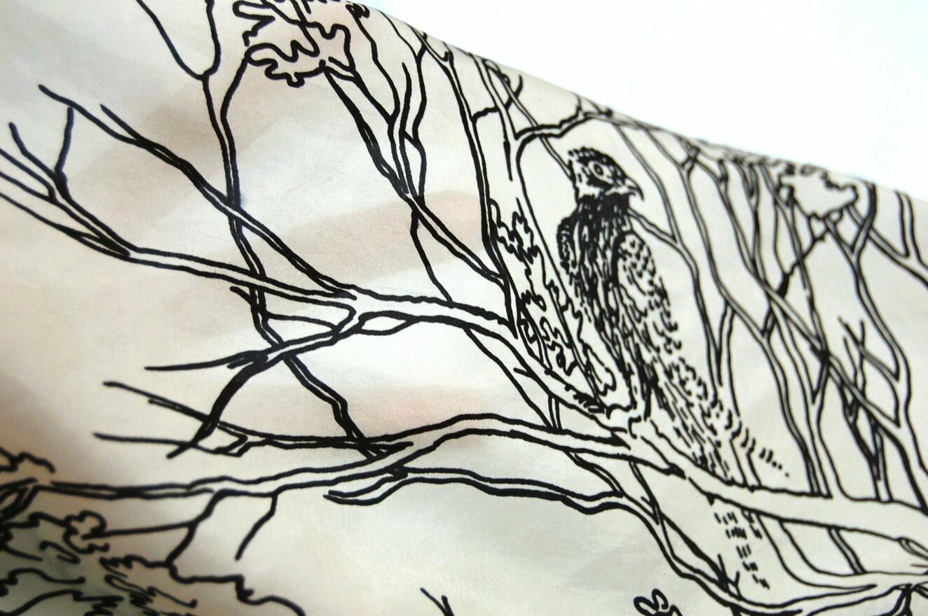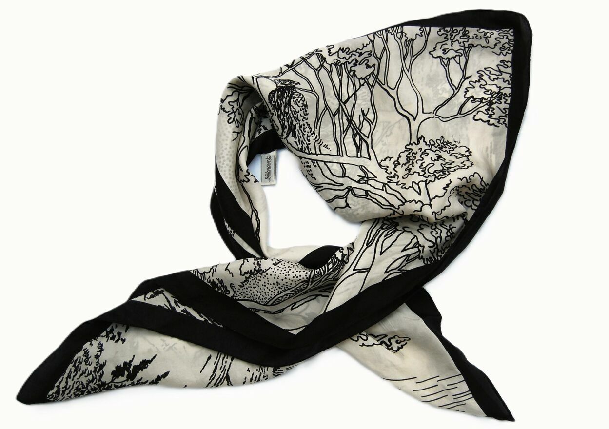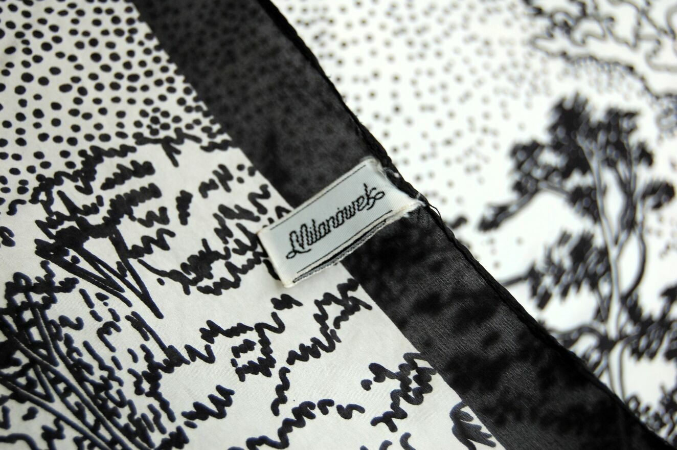 Piękna, unikatowa chusta jedwabna z graficznym pejzażem, Milanówek, Polska, wczesne lata 90. Chusta jest wykonana w 100% z naturalnego jedwabiu. Ma kolor ecru z czarnym wzorem i obrzeżem. Stan zachowania bardzo dobry z niewielkimi niedoskonałościami, widocznymi na zdjęciach ze zbliżeniem: przy jednym rogu jest dziurka (lewy, górny róg przy drzewie z ptakiem na gałęzi), zaciągnięta nić w okolicy środka, nieco u dołu, na wysokości drzew, maleńka dziurka w prawym, górnym rogu nad gałęzią dużego drzewa.Wymiary: 85 x 82 cm.