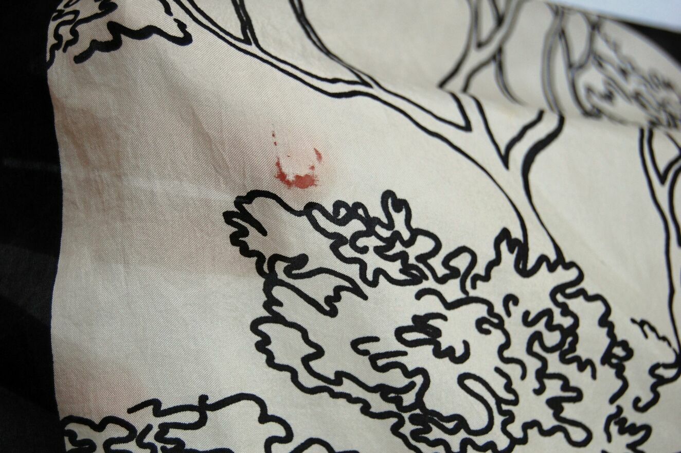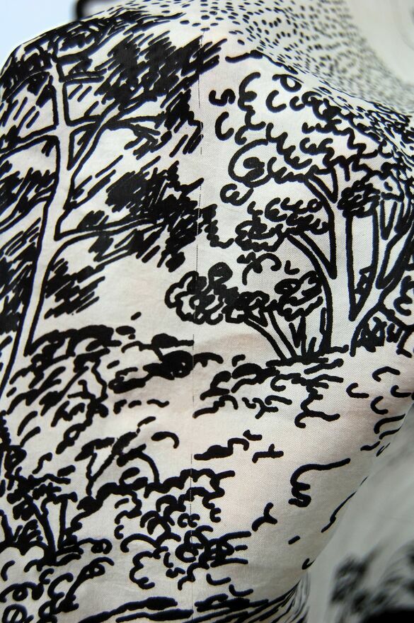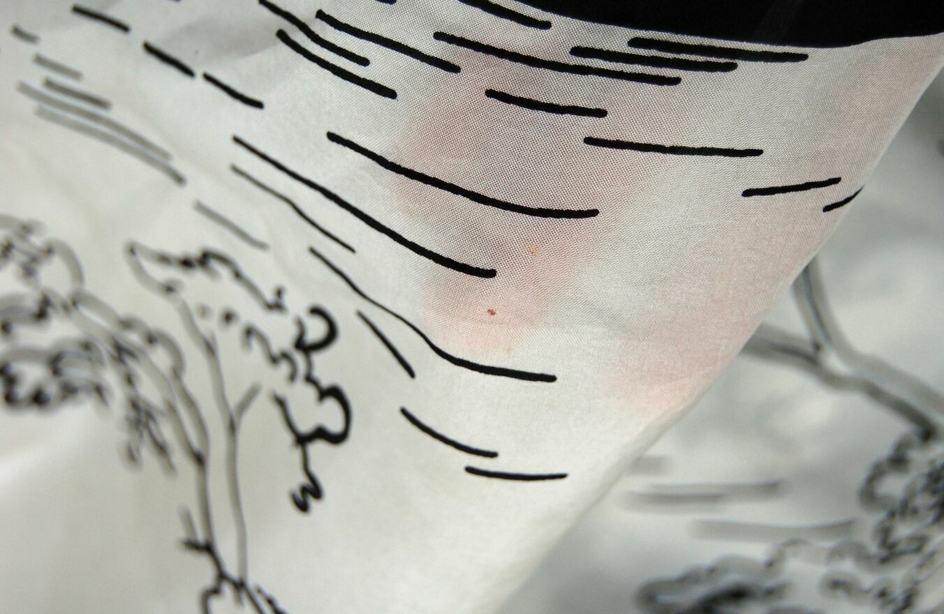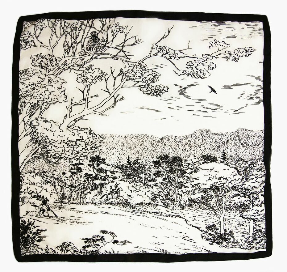 Piękna, unikatowa chusta jedwabna z graficznym pejzażem, Milanówek, Polska, wczesne lata 90. Chusta jest wykonana w 100% z naturalnego jedwabiu. Ma kolor ecru z czarnym wzorem i obrzeżem. Stan zachowania bardzo dobry z niewielkimi niedoskonałościami, widocznymi na zdjęciach ze zbliżeniem: przy jednym rogu jest dziurka (lewy, górny róg przy drzewie z ptakiem na gałęzi), zaciągnięta nić w okolicy środka, nieco u dołu, na wysokości drzew, maleńka dziurka w prawym, górnym rogu nad gałęzią dużego drzewa.Wymiary: 85 x 82 cm.