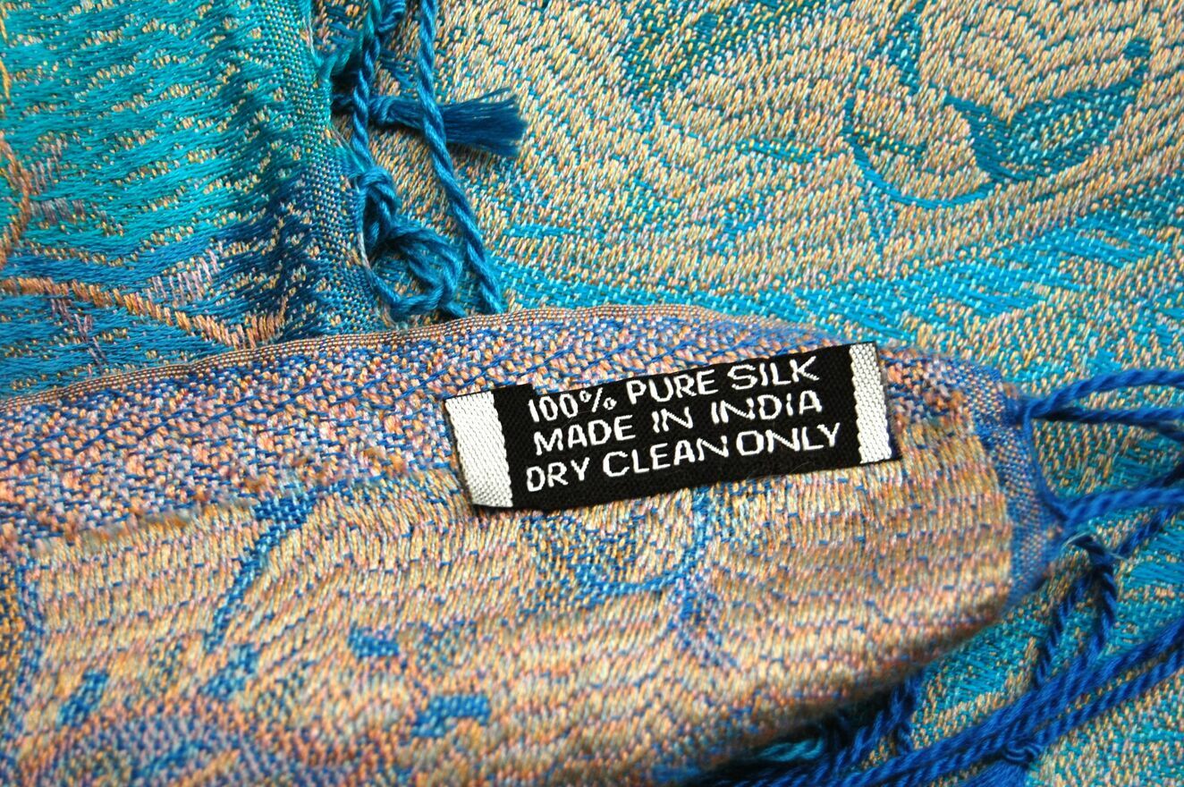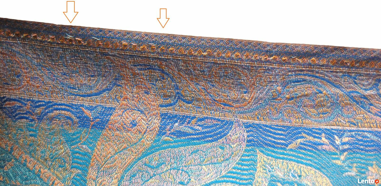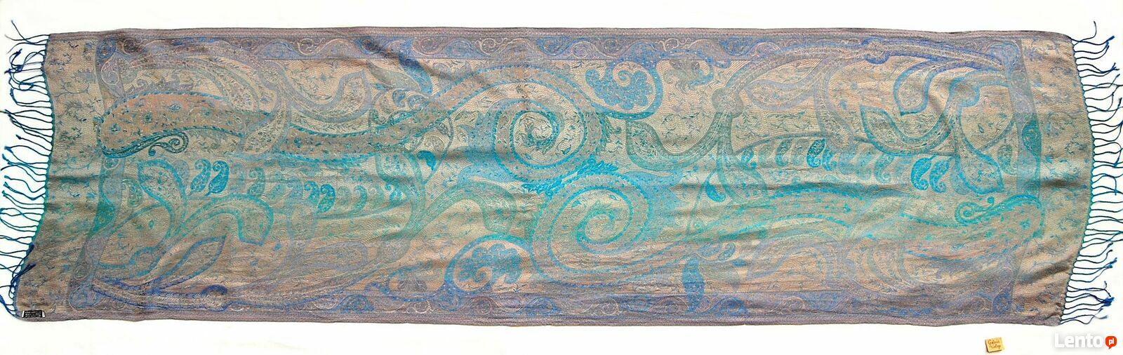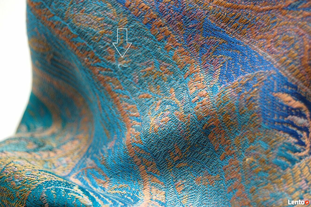 Luksusowy, jedwabny szal marki Indiska we wzór paisley. Skład materiału: 100% jedwab. Szal ma piękne kolory: turkus, błękit, liliowy, złocisto-brzoskwiniowy. Stan zachowania bardzo dobry, miejscami przy brzegu i na powierzchni są wystające nitki - pokazane strzałkami na zdjęciach.Wymiary: