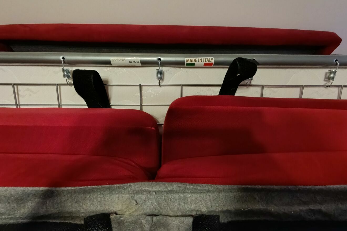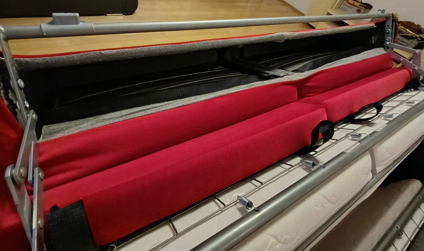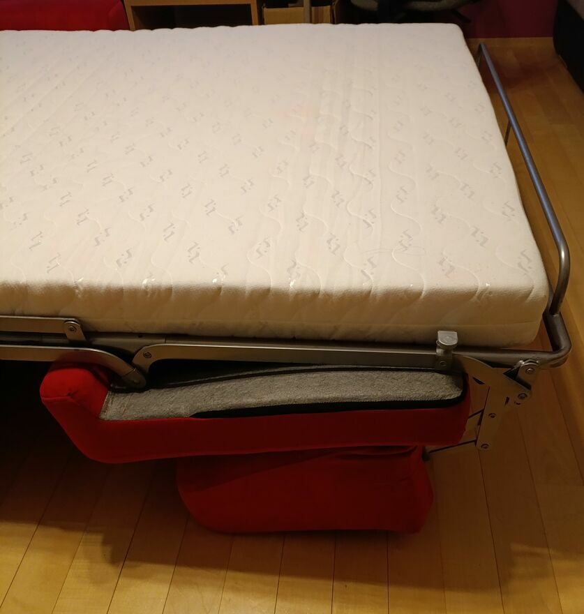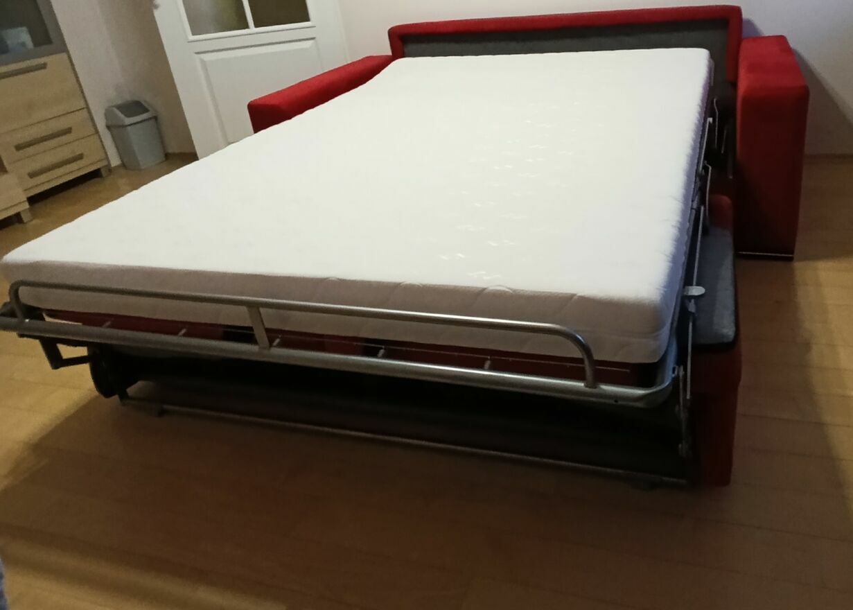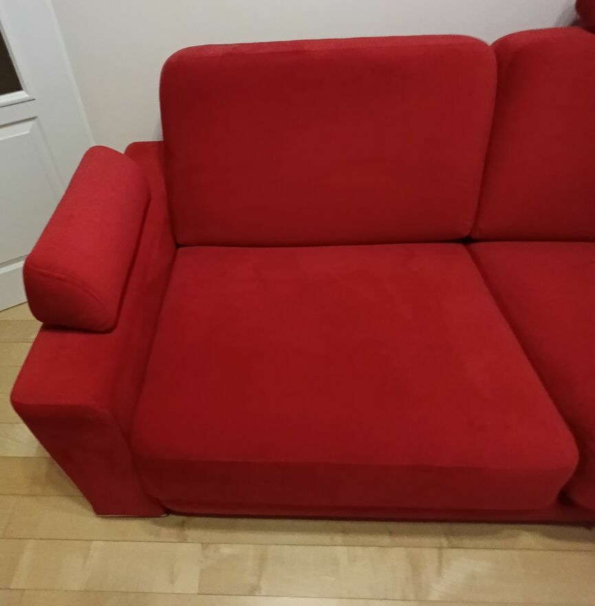 Zastosowane rozwiązanie (nie śpi się na powierzchni, na której się siedzi) chroni kanapę przed szybkim wyeksploatowaniem. Wygodny materac chroni zasuwany na zamek błyskawiczny, zdejmowalny pokrowiec. Kanapa łatwo się otwiera i składa praktycznie 1 ruchem. Wyposażona jest nawet w niewielkie schowki na małe poduszki, koc, prześcieradła lub bieliznę nocną. Zdejmowane zagłówki zwiększają komfort siedzenia. Tapicerka bardzo przyjemna w dotyku z wytrzymałego materiału przypominającego plusz w głębokim, czerwonym kolorze, który nie najlepiej widać na zdjęciach.