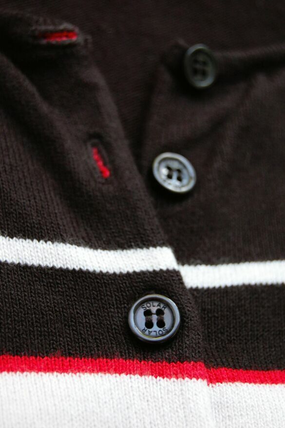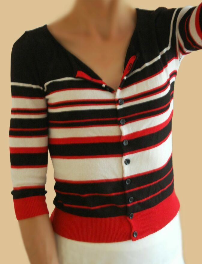 Lekki kardigan damski w paski firmy Solar na okres wiosenno-letni. Rozmiar 36 (S). Materiał jest delikatny w dotyku, lekki, przewiewny, umiarkowanie rozciągliwy - wygodny. Skład: 72% wiskoza, 28% nylon. Ponadczasowy zestaw kolorów: czarny, biały i czerwony podkreśla elegancję. Kardigan jest zapinany na czarne, logowane guziczki z napisem "Solar". Górna metka z logo firmy została usunięta. Rękawy mają długość do łokci (3/4). Stan zachowania bardzo dobry, kardigan był rzadko noszony, a materiał jest wysokiej jakości: nie mechaci się, kolory nie blakną, są wyraziste.Wymiary mierzone na płasko: