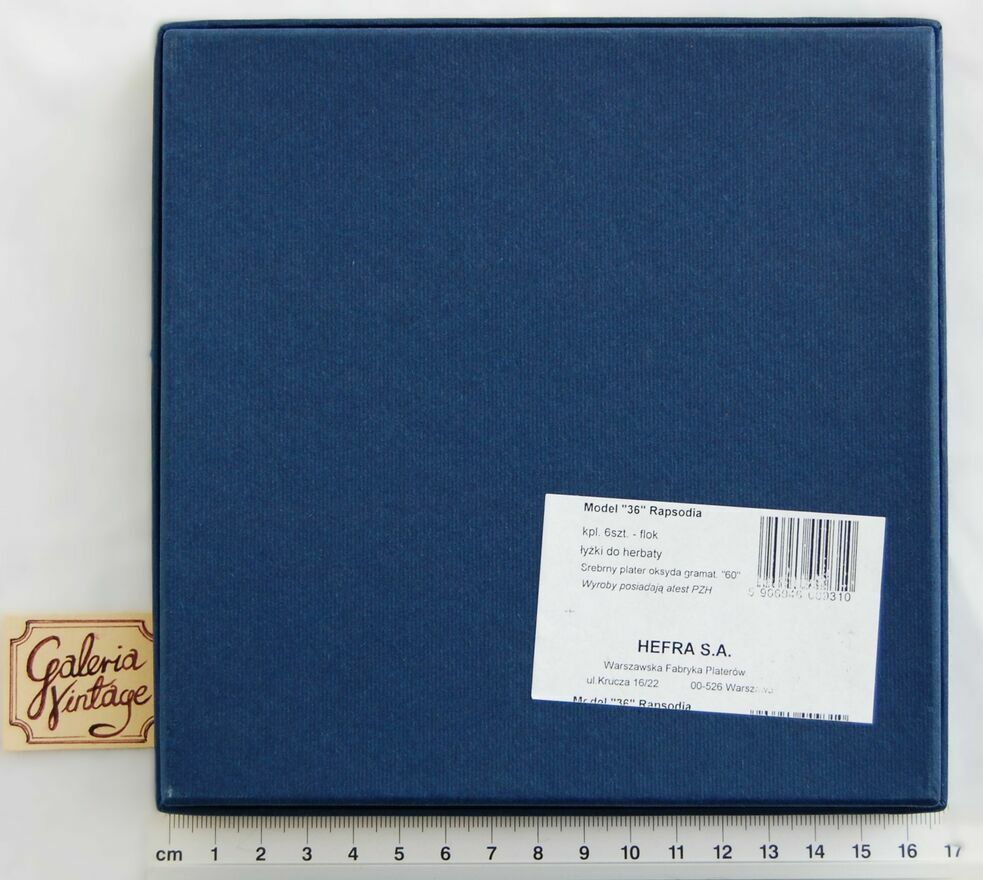 Nowy komplet sześciu łyżeczek do herbaty firmy Hefra, model "36" Rapsodia. Łyżeczki są posrebrzane i oksydowane. Wykończenie jest błyszcząco -satynowe. Wzór na uchwycie jest dwustronny. Na rewersie jest wybity napis "H MET-67". Komplet jest nowy, w oryginalnym tekturowym opakowaniu.Długość łyżeczek: 14,4 cm.