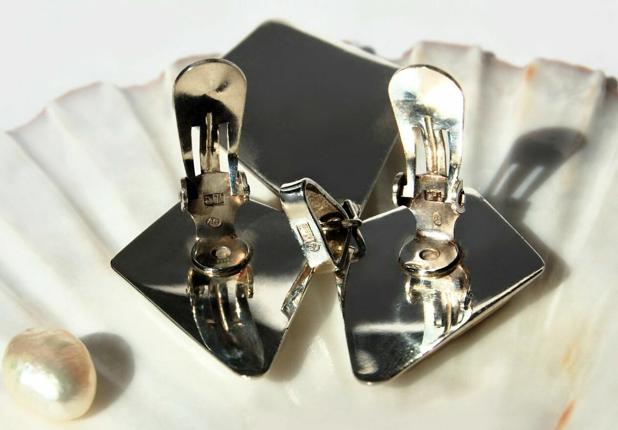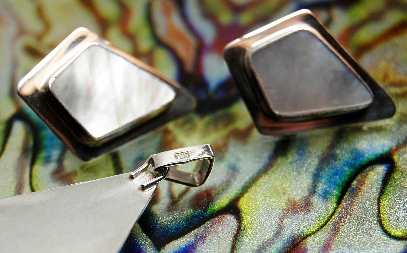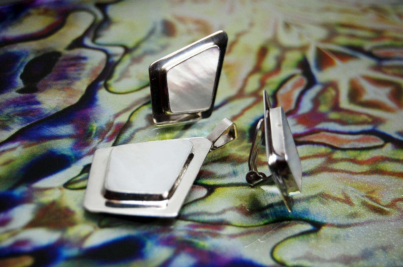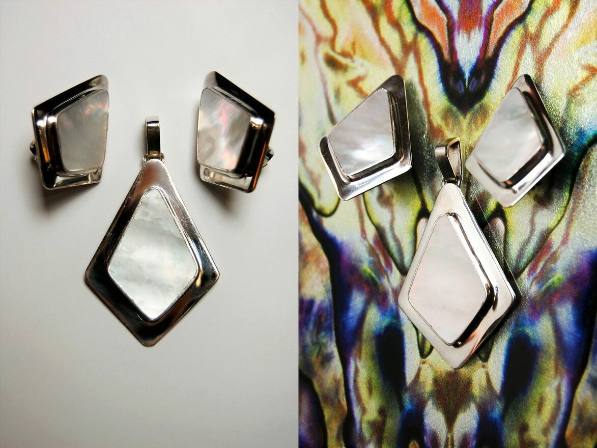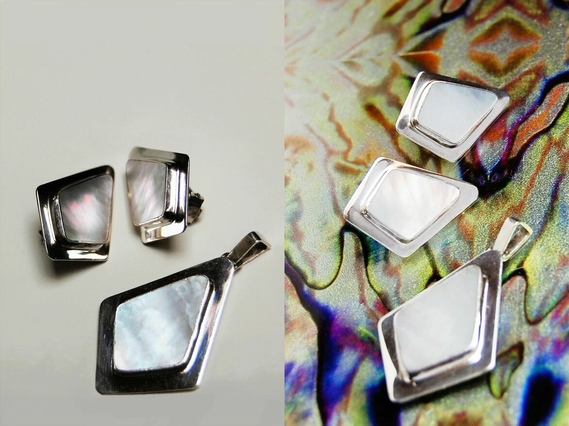 Piękny komplet: klipsy i wisior w kształcie rombów z masy perłowej i srebra próby 925. Masa perłowa jest naturalna, niebarwiona, ma jasny, srebrzystobiały kolor z różowo-zielono-błękitną opalizacją. Punce są wybite na trójkątnym uchwycie wisiora i wewnątrz uchwytów klipsów. Komplet jest nowy, bez papierowej etykiety.Wymiary wisiora (długość x szerokość x głębokość x średnica zawieszki): 5 x 2,9 x 0,4 x 0,4 (cm).