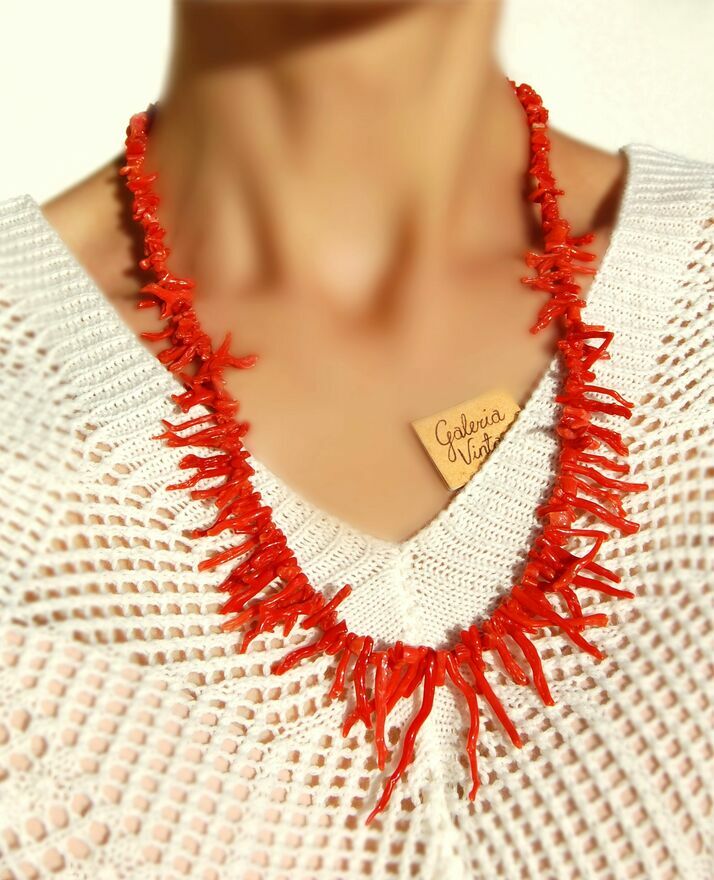 Piękny, stary naszyjnik z naturalnego koralowca. Gałązki mają stopniowaną wielkość, naturalną barwę koralową. Są nawleczone na podwójną nić w kolorze koralowym, ze złotym, metalowym zapięciem. Stan zachowania bardzo dobry.Wymiary: