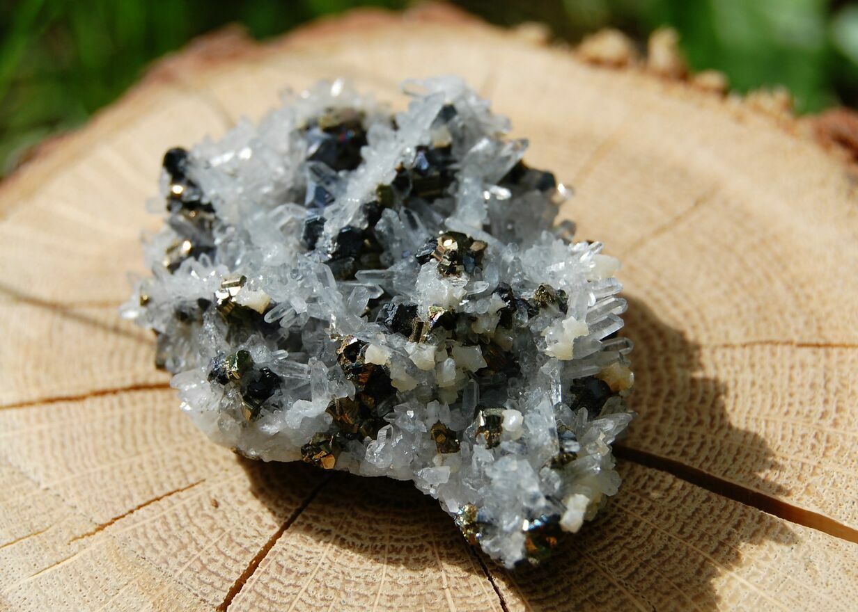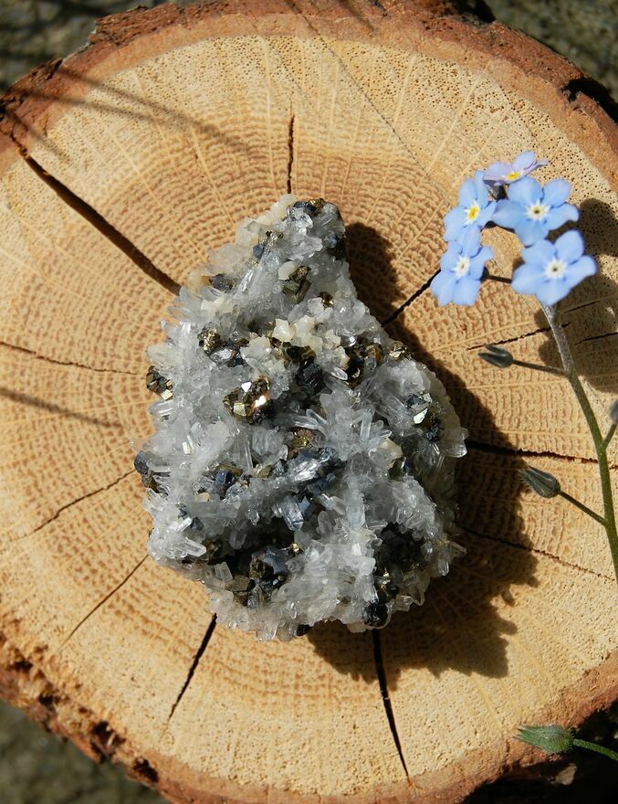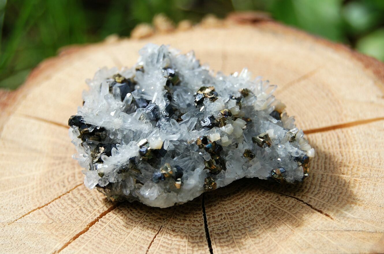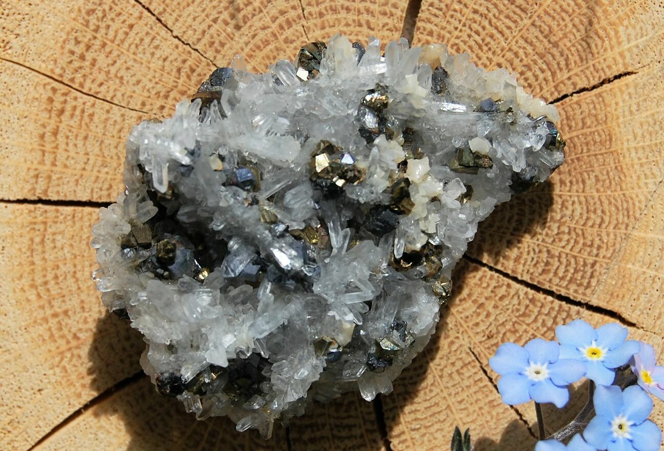 Kryształ górski, piryt, sfaleryt, szczotka, łezka, kropla