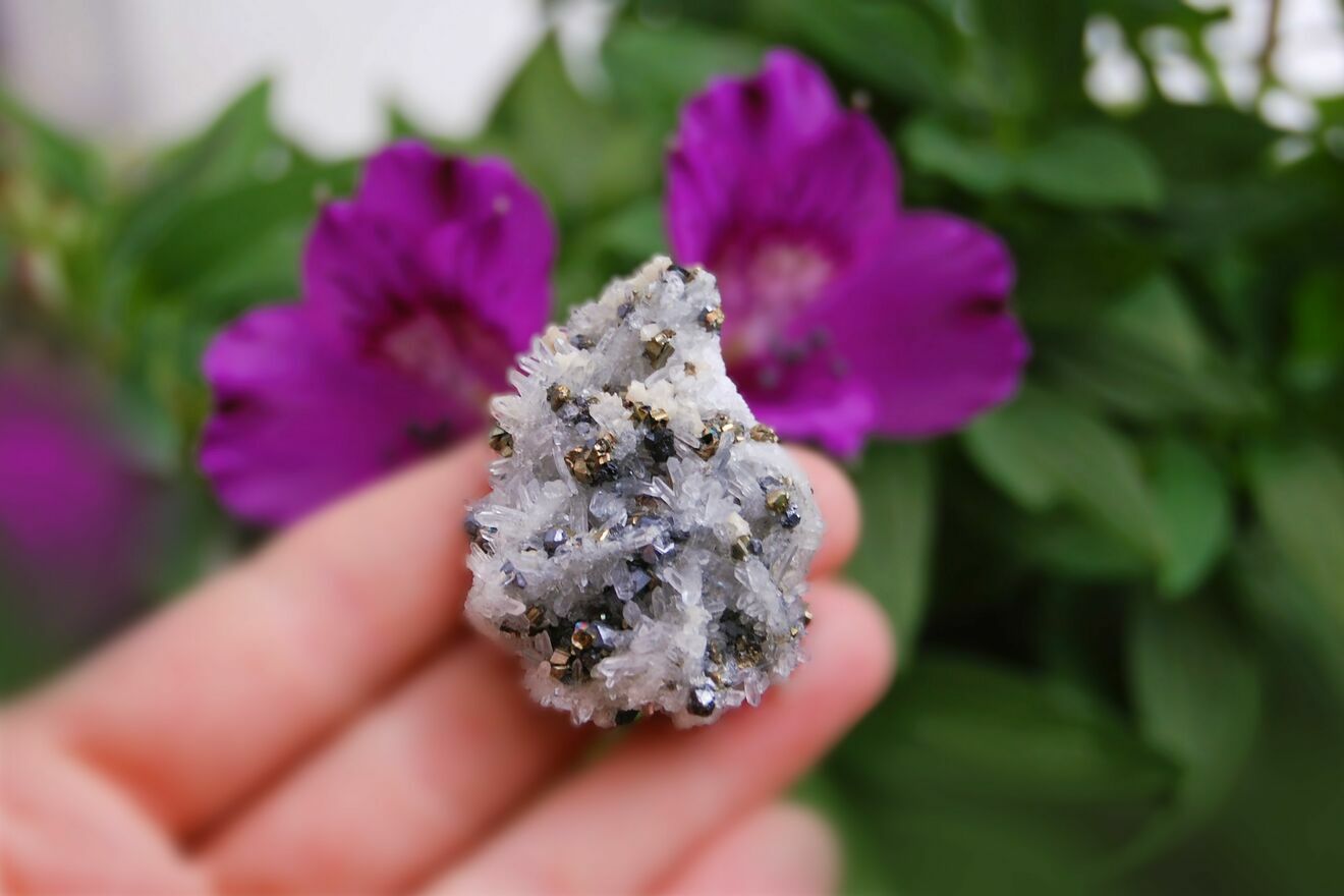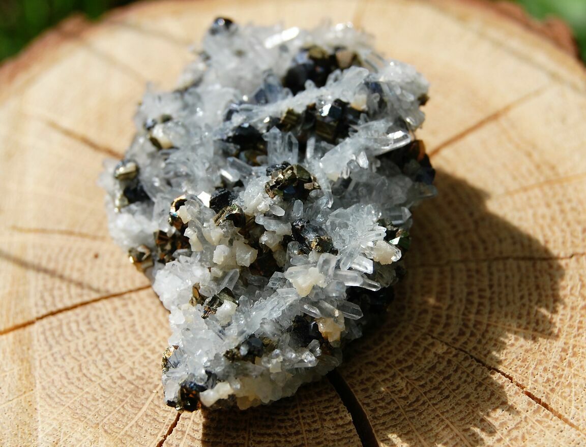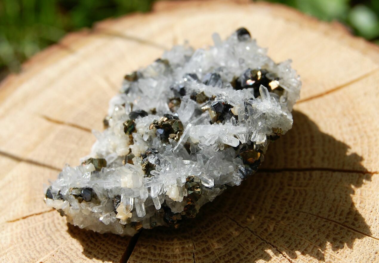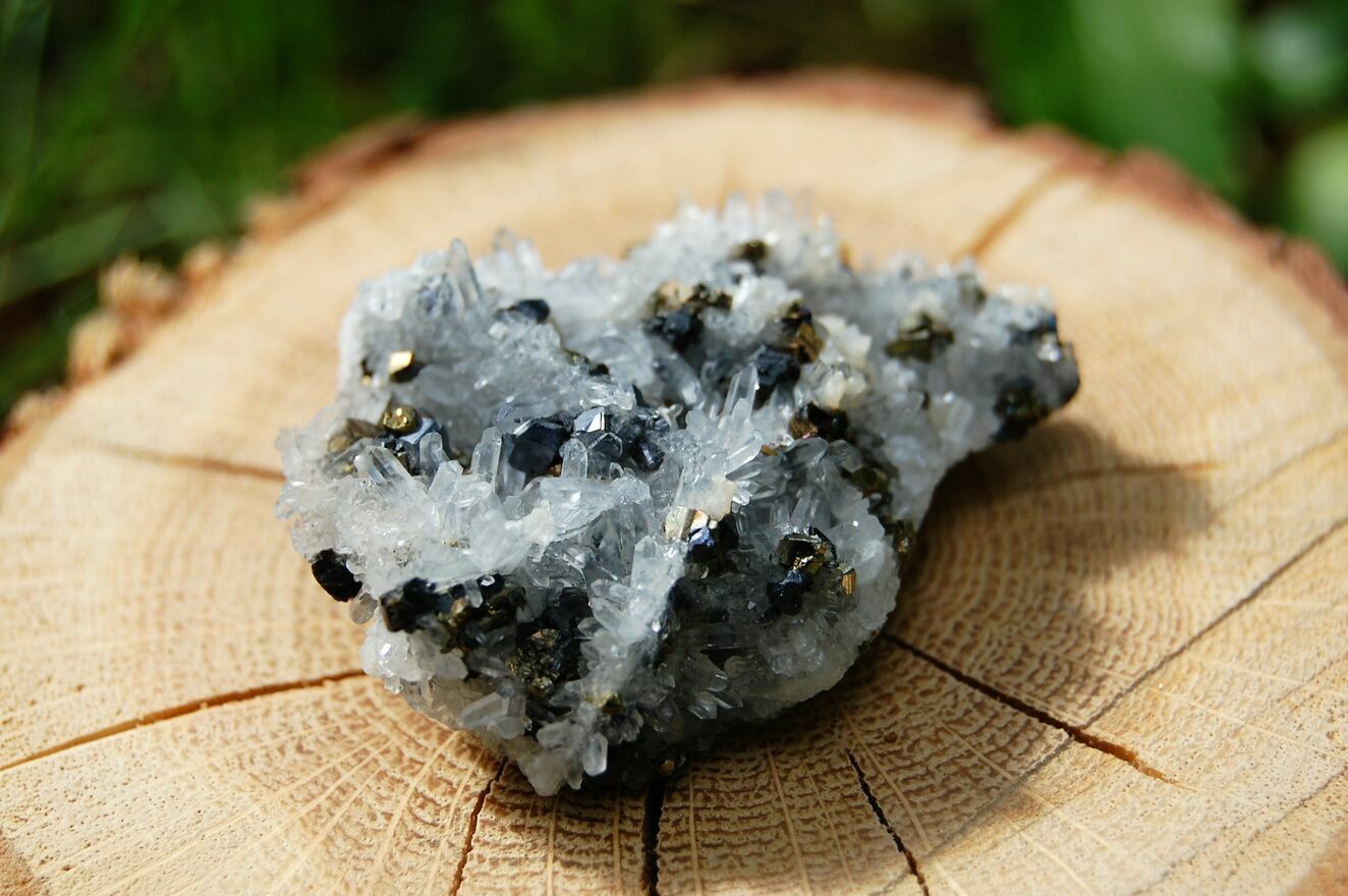 Kryształ górski, piryt, sfaleryt, szczotka, łezka, kropla