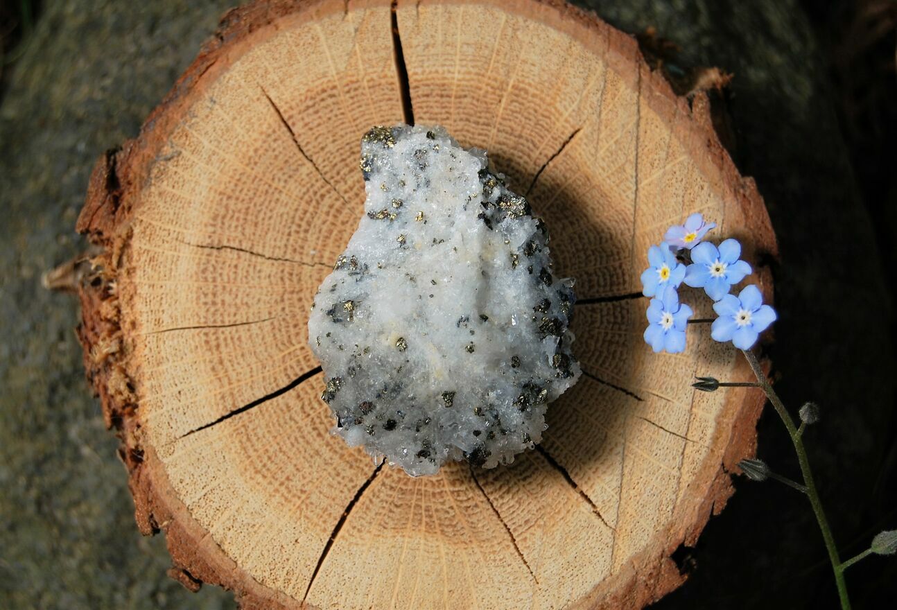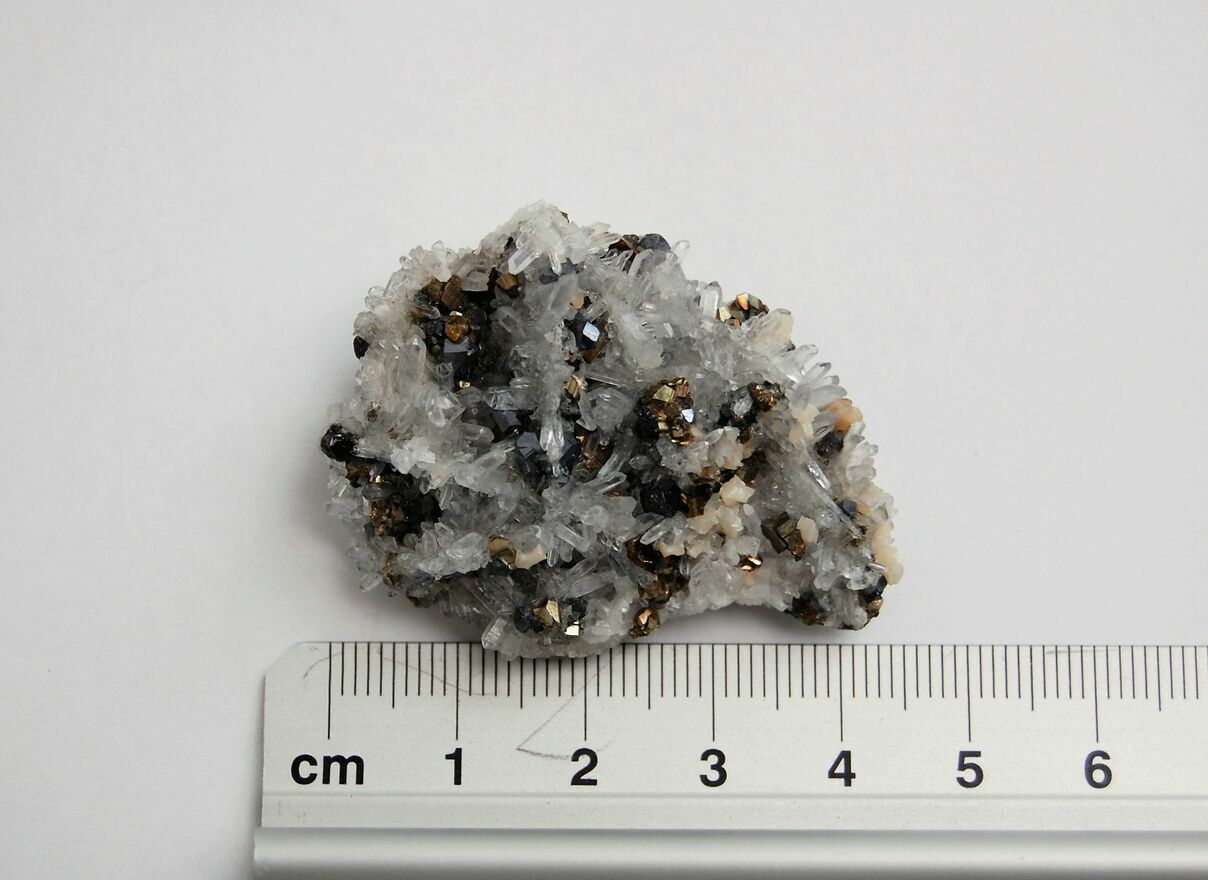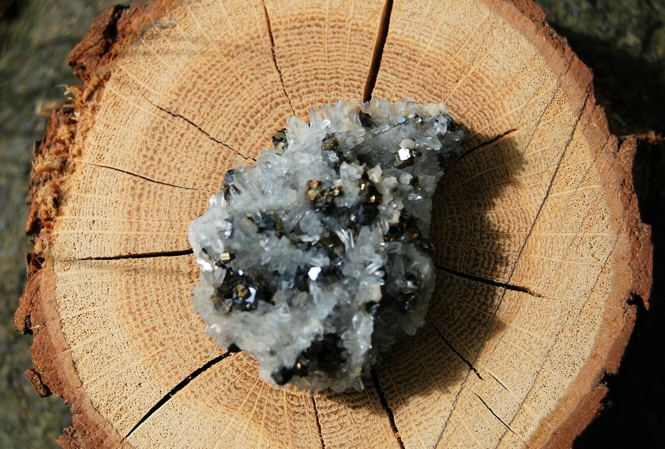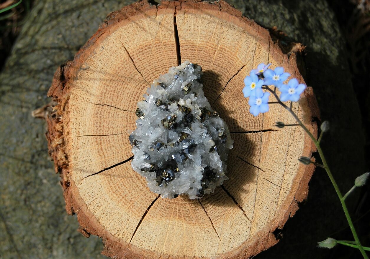 Kryształ górski, piryt, sfaleryt, szczotka, łezka, kropla