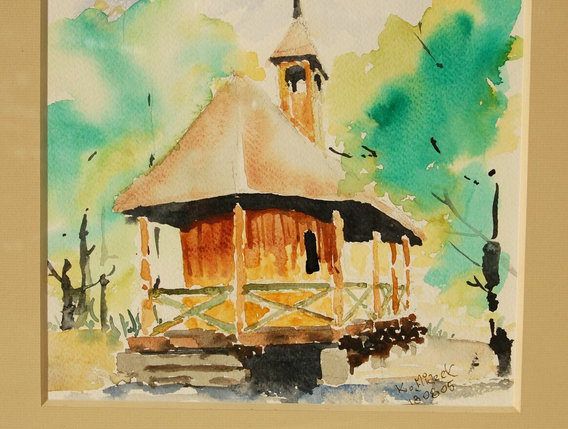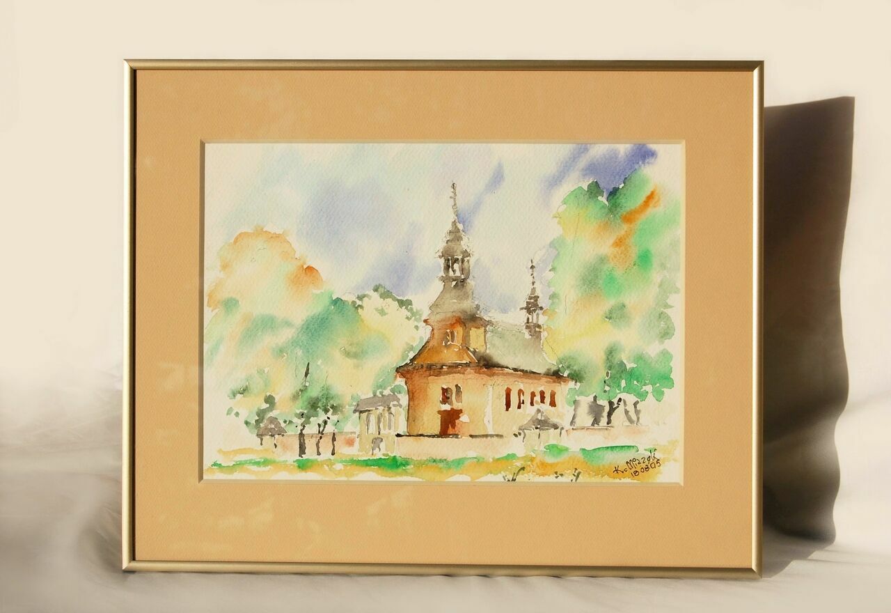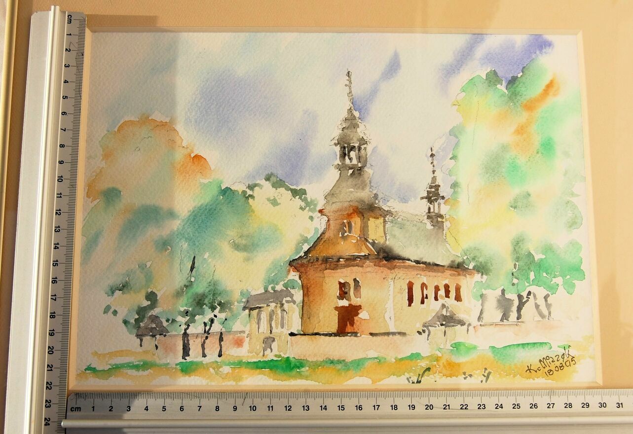 1. Akwarela przedstawiająca starą architekturę drewnianą - z cyklu cerkwi z terenów południowo-wschodniej Polski. Krzysztof Miazek, 18.08.05 - sygnatura w prawym, dolnym rogu. Akwarela jest oprawiona w metalową ramę w kolorze platynowym, ze szkłem i z passe-partout w kolorze ciepłego, piaskowego beżu. Obraz jest nowy.Zdjęcia zostały wykonane w naturalnym, dziennym oświetleniu.