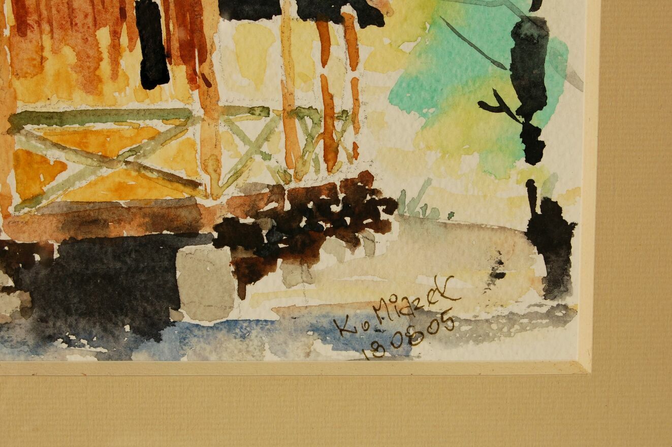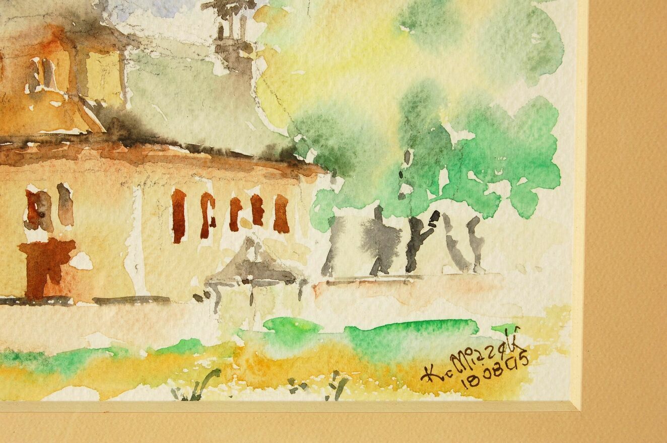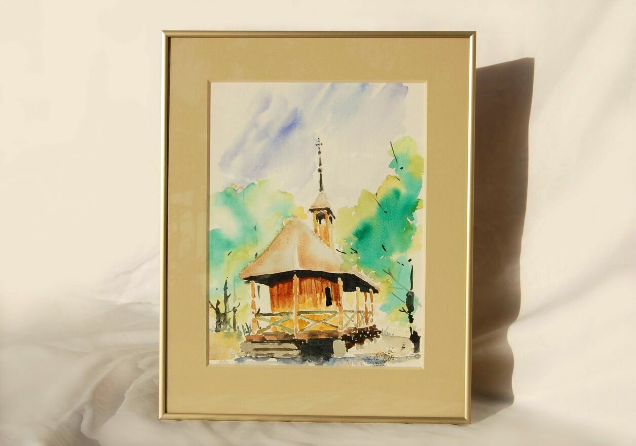 1. Akwarela przedstawiająca starą architekturę drewnianą - z cyklu cerkwi z terenów południowo-wschodniej Polski. Krzysztof Miazek, 18.08.05 - sygnatura w prawym, dolnym rogu. Akwarela jest oprawiona w metalową ramę w kolorze platynowym, ze szkłem i z passe-partout w kolorze ciepłego, piaskowego beżu. Obraz jest nowy.Zdjęcia zostały wykonane w naturalnym, dziennym oświetleniu.