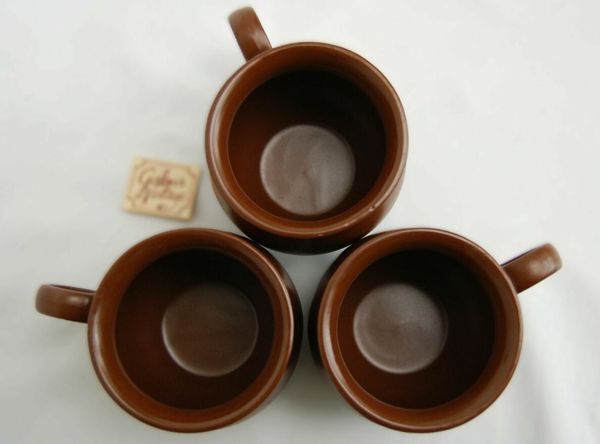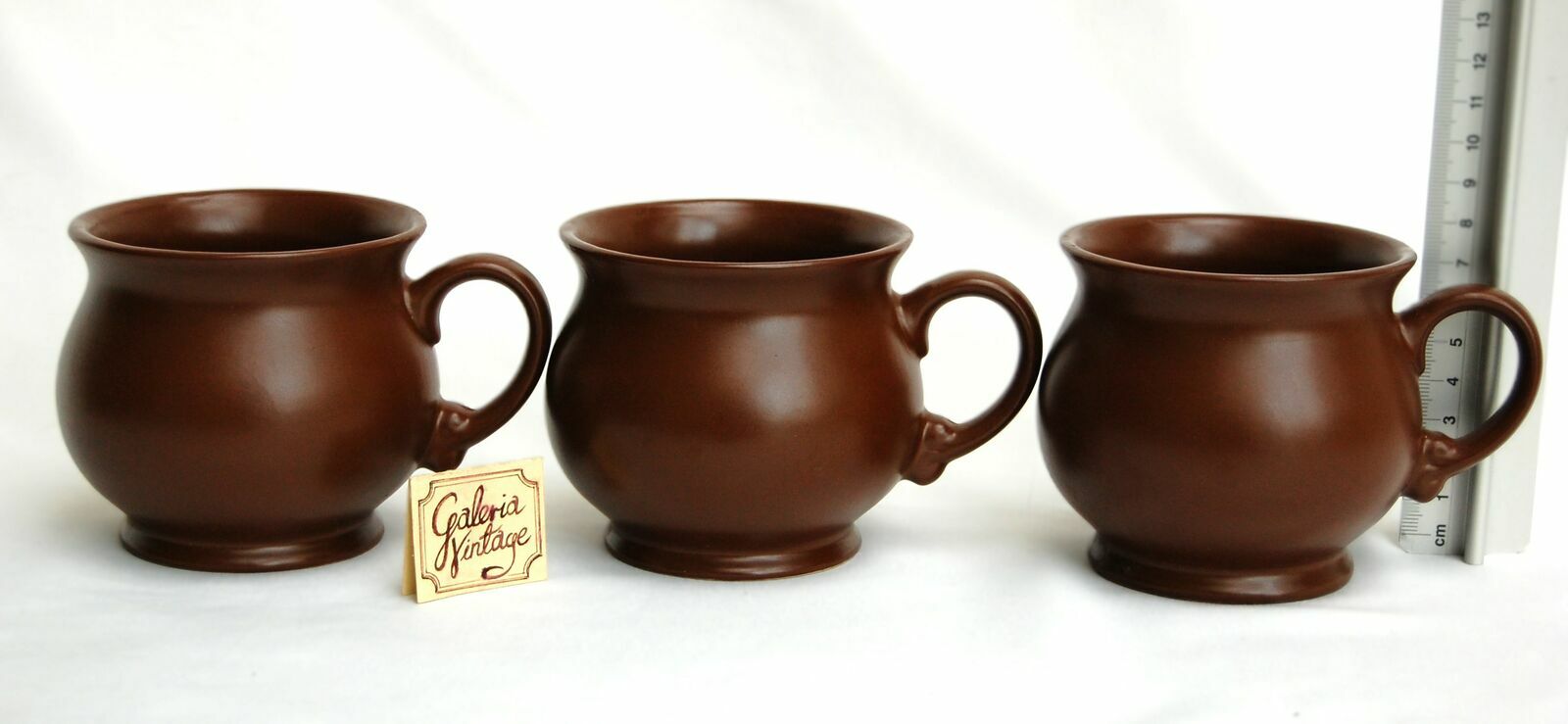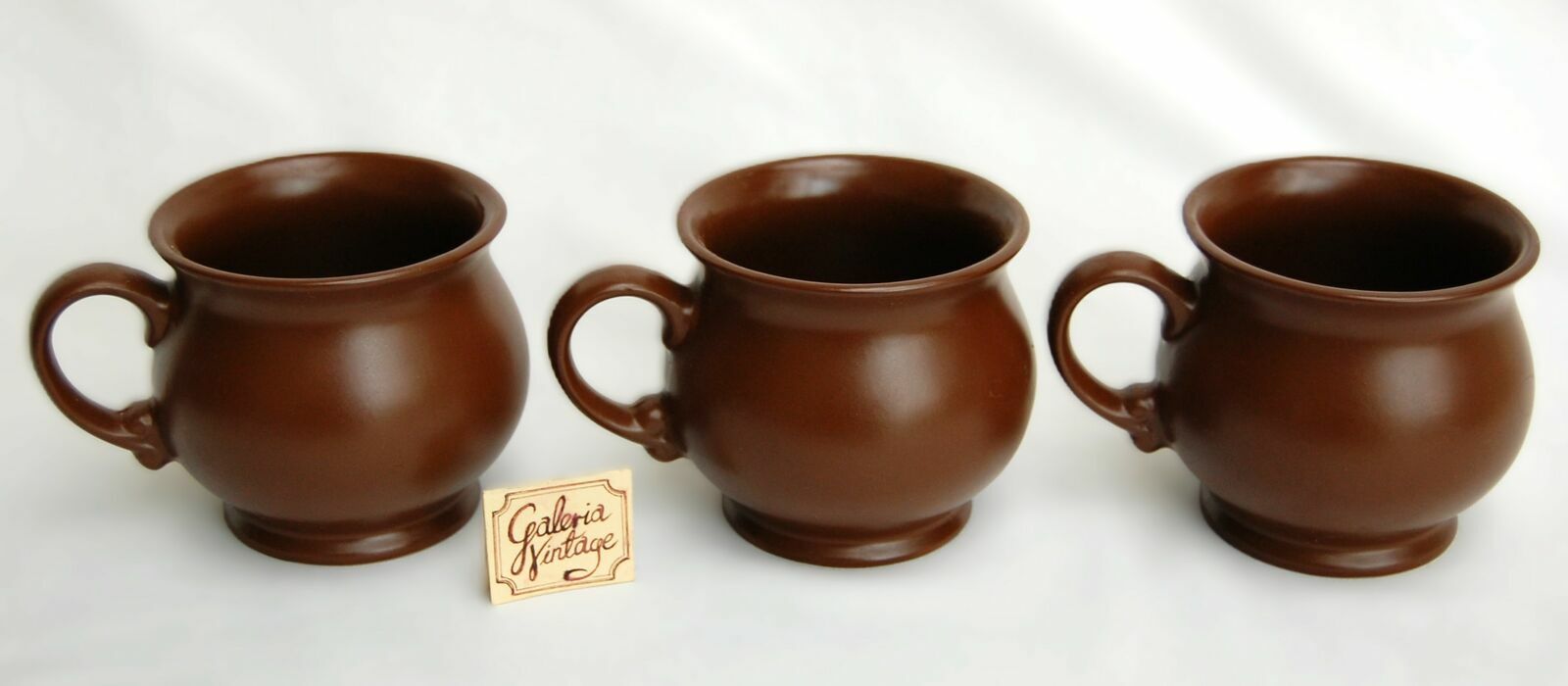 Trzy piękne, kamionkowe kubki do grzanego wina, miodu pitnego, czekolady lub barszczu. Pojemność 300 ml. Kubki są polskiej produkcji, bez sygnatury. Kolor czekoladowobrązowy. Powierzchnia jest gładka, satynowa. Uszka duże, ładnie wyprofilowane. Stan: nowe.Cena dotyczy trzech sztuk. Kubki można zakupić na sztuki. Cena 1 kubka: 35 zł.
