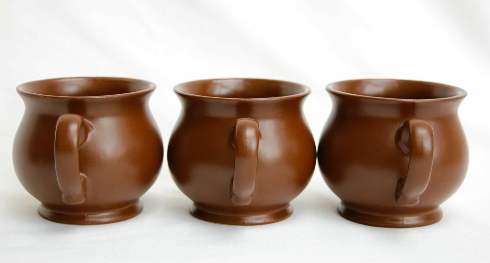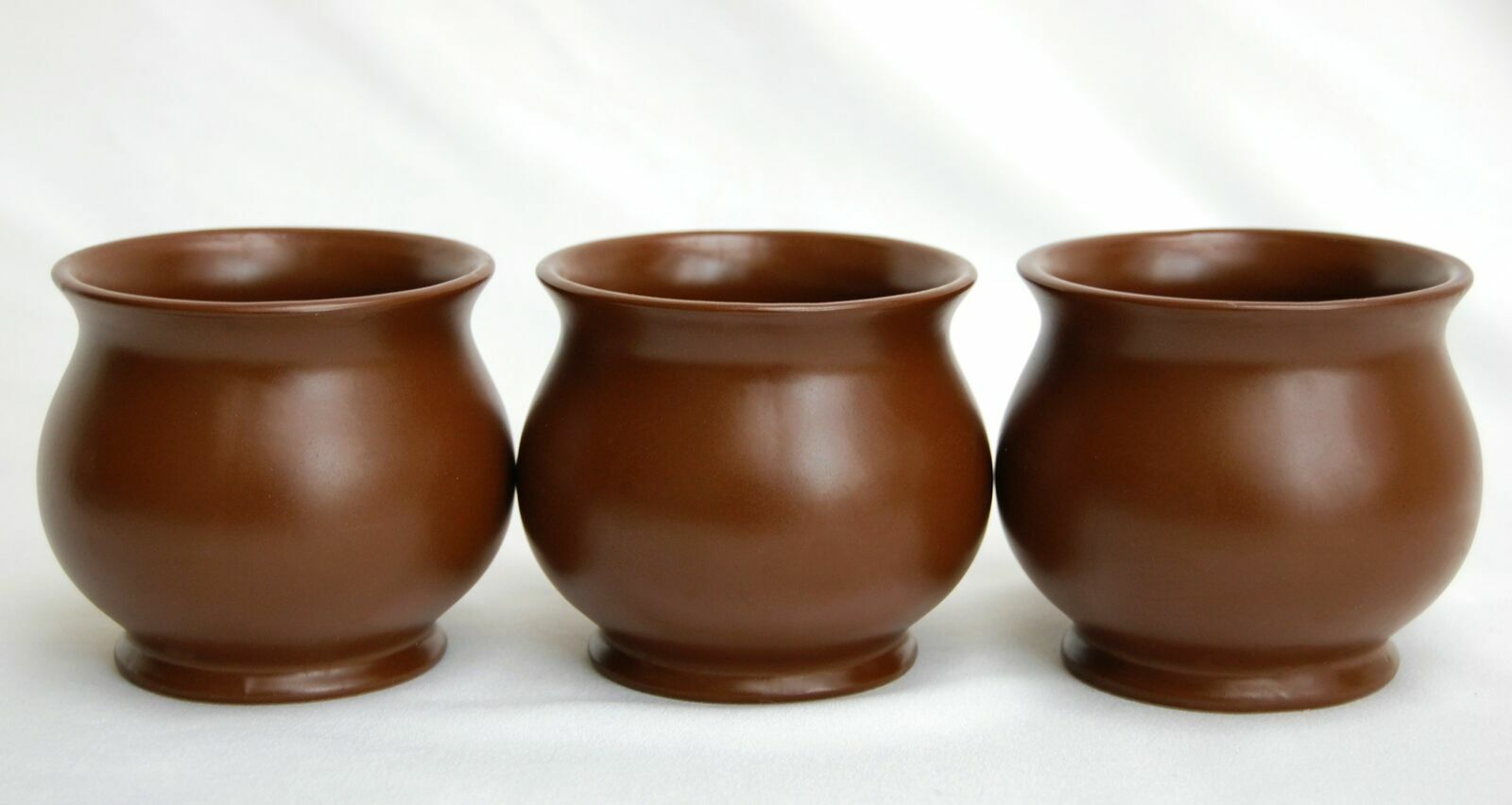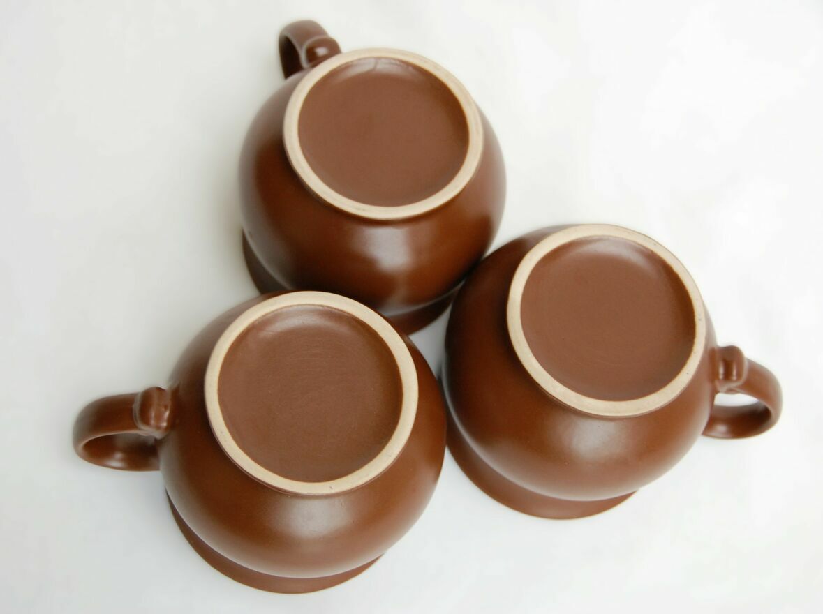 Trzy piękne, kamionkowe kubki do grzanego wina, miodu pitnego, czekolady lub barszczu. Pojemność 300 ml. Kubki są polskiej produkcji, bez sygnatury. Kolor czekoladowobrązowy. Powierzchnia jest gładka, satynowa. Uszka duże, ładnie wyprofilowane. Stan: nowe.Cena dotyczy trzech sztuk. Kubki można zakupić na sztuki. Cena 1 kubka: 35 zł.