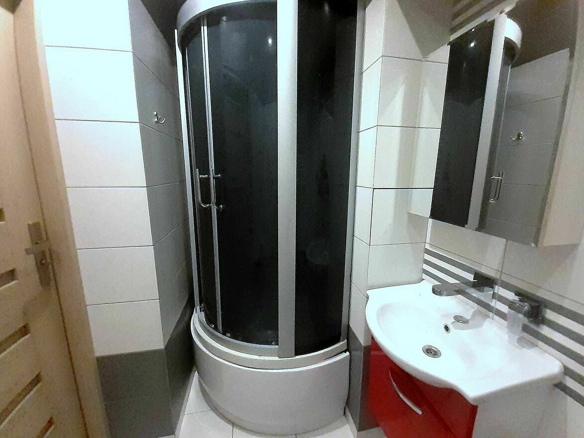 Łazienka i WC są razem. W łazience jest prysznic, toaleta, umywalka z szafką, lustro, półki na kosmetyki.