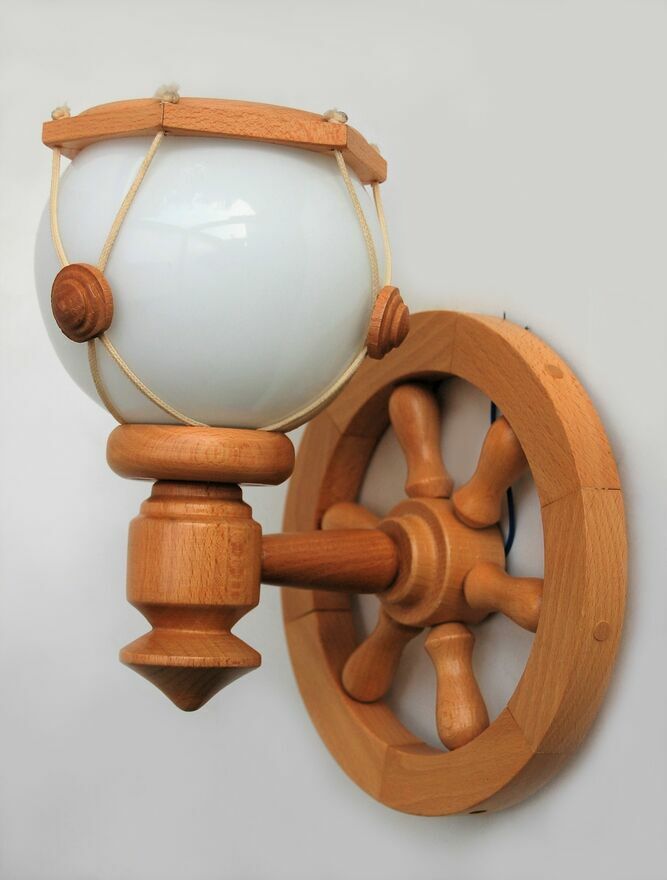 Piękna lampa marynistyczna, kinkiet na kole sterowym, L&L. Lampa jest wykonana z jasnego drewna w naturalnym beżowym kolorze, lakierowanego. Kulisty klosz jest mlecznobiały. Ozdobne elementy drewniane na kloszu są łaczone naturalnym, jasnym sznurkiem. Żarówka 60 W jest dołączona do lampy (wykręcona do zdjęć). Stan: nowa.Dostępny jest jeden kinkiet.