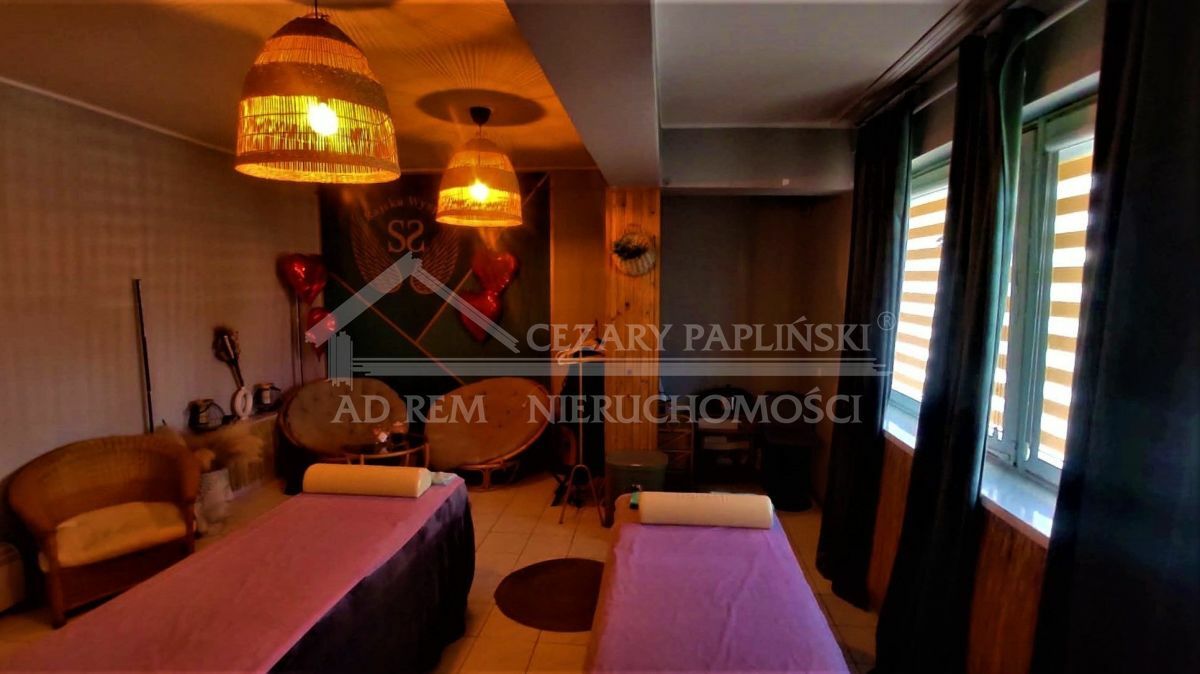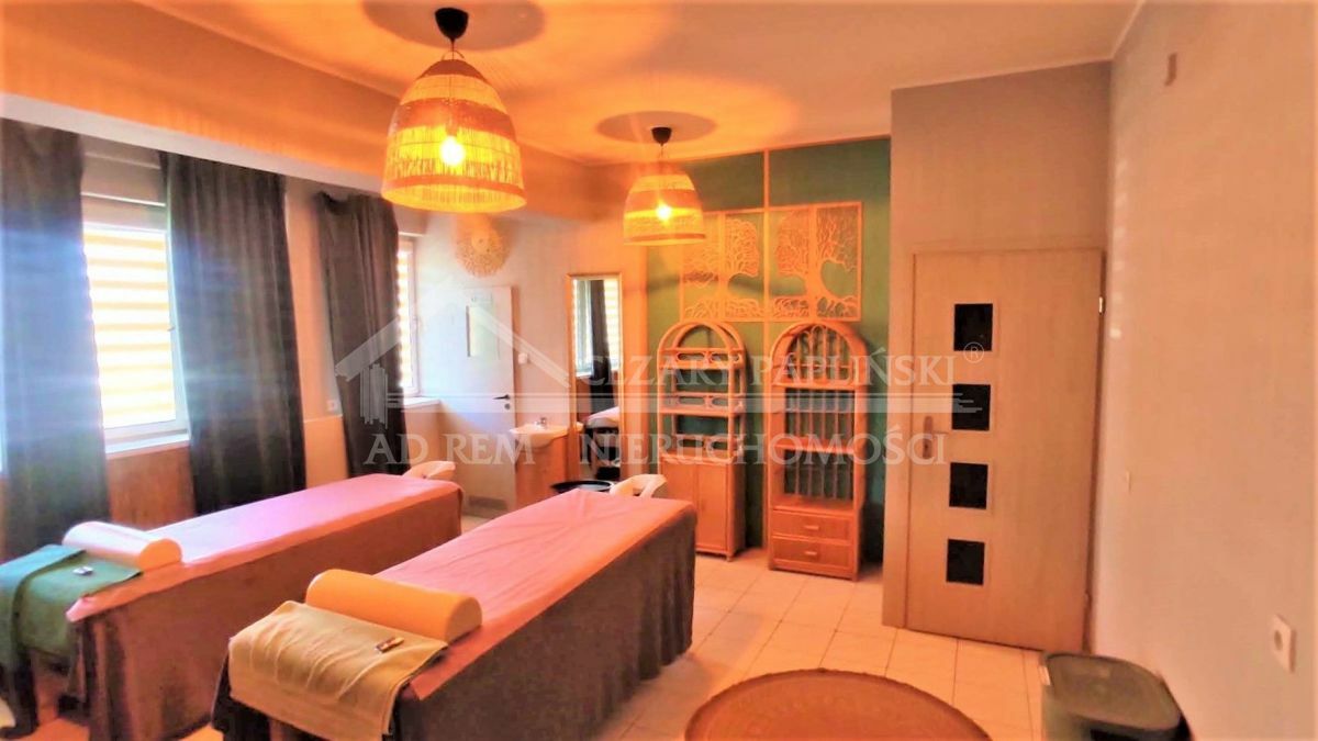 Piętro: duży pokój zabiegowy z 2 stołami do masażu (regulowana wysokość) dodatkowy zlew; część wypoczynkowa z rattanowymi fotelami i stolikiem; zaplecze / część socjalna oraz toaleta. Lokal posiada duże okna, oświetlenie górne i dekoracyjne żyrandole.