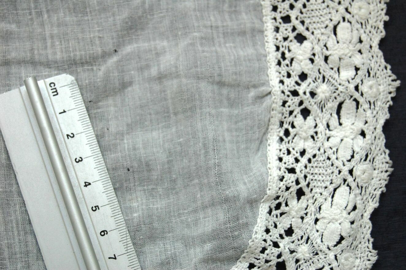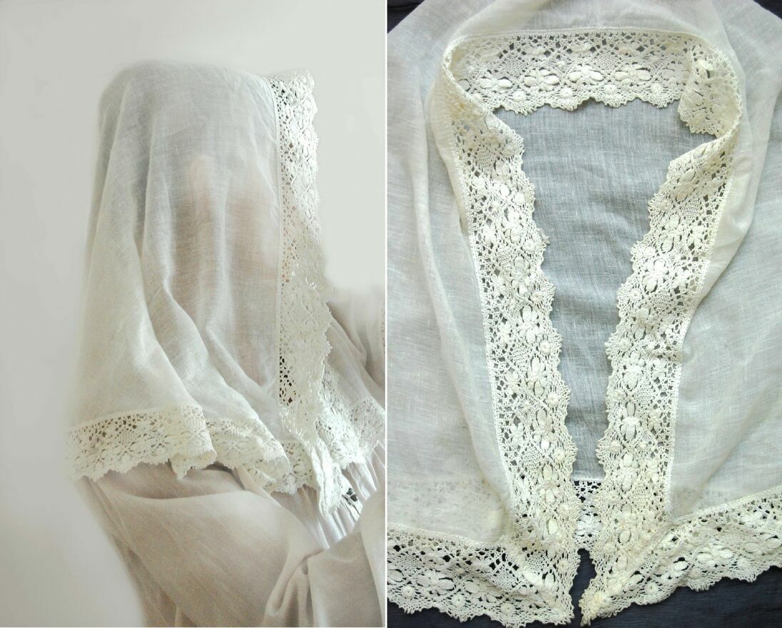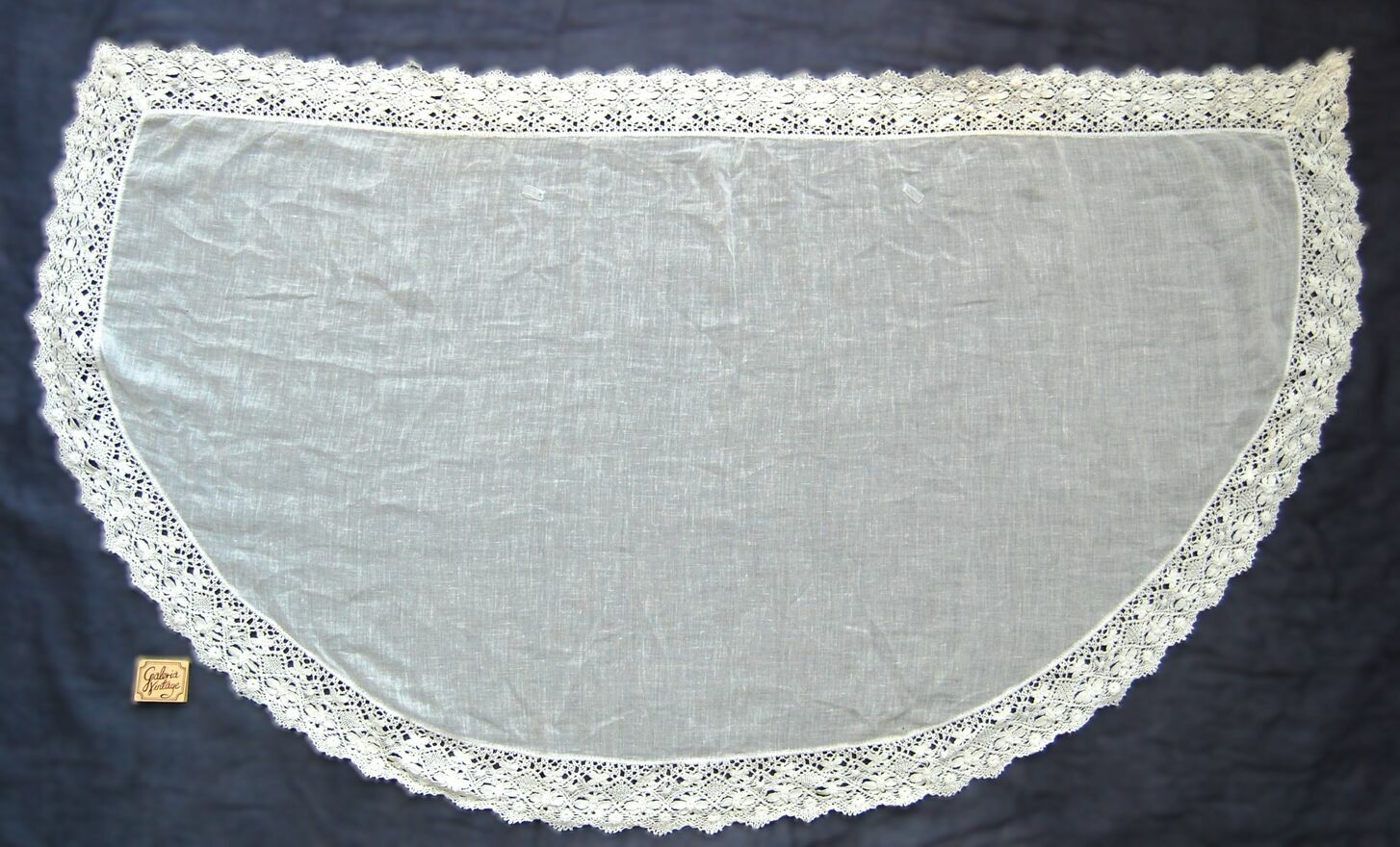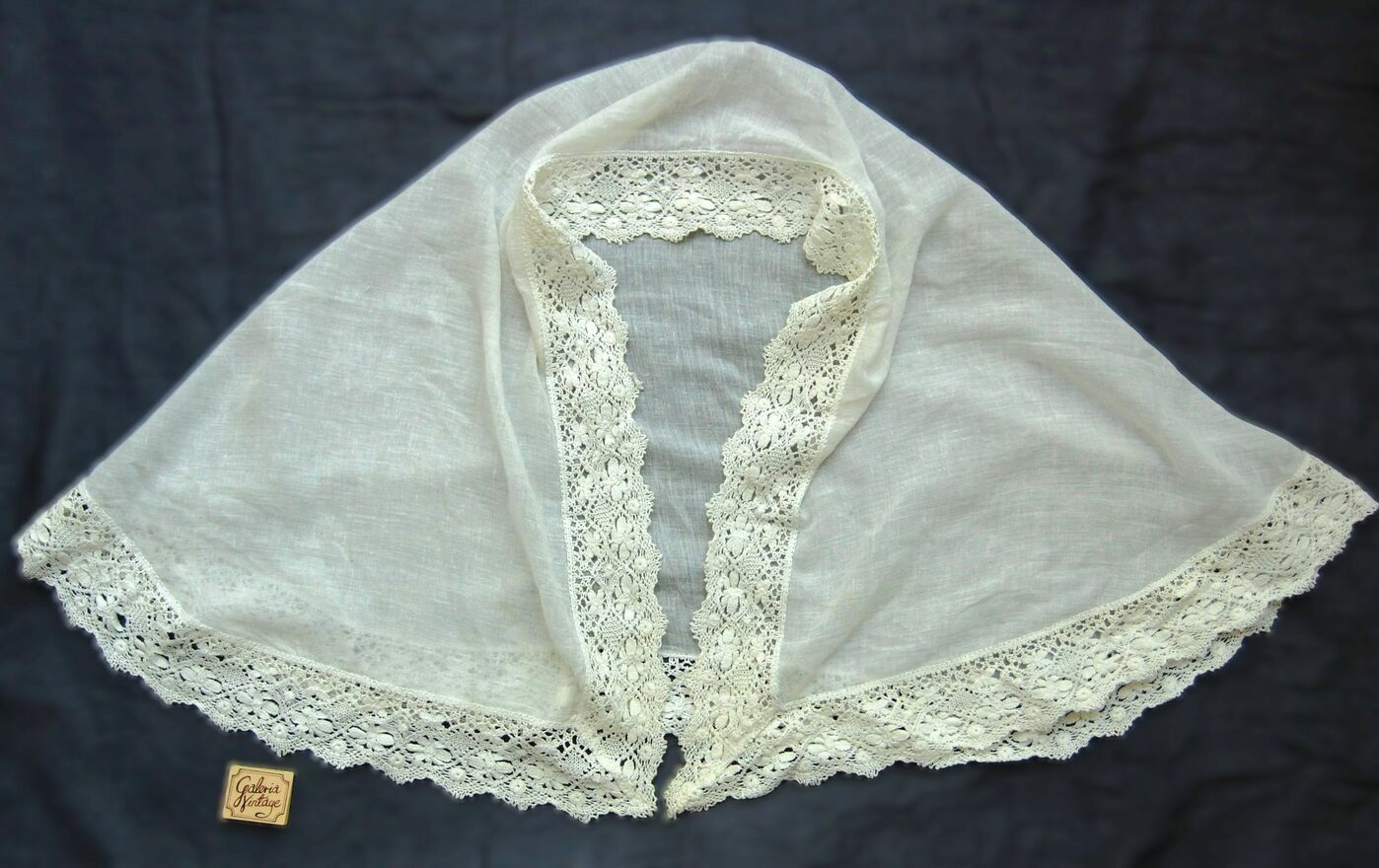 Mantylka - tradycyjne, damskie nakrycie głowy na Mszę Świętą: nieodłączny element godnego ubioru kobiecego. Chusta jest ręcznie uszyta z niezwykle delikatnej, półprzezroczystej bawełny w kolorze ecru. Jasny kolor mantylki jest przeznaczony dla panien, mężatki noszą ciemne barwy. Brzeg mantylki jest obszyty bawełnianą koronką. od spodu są dwa uchwyty na spinki, którymi można upiąć mantylkę, wykonane z półprzezroczystej wstążki. Chusta po założeniu na głowę okrywa też ramiona. Jest lekka, przewiewna. Stan zachowania bardzo dobry. W dwóch miejscach: w pobliżu jednego rogu i przy dolnej, półokrągłej krawędzi jest po kilka maleńkich dziurek (pokazane na zdjęciach ze zbliżeniem), prawdopodobnie dzieło moli. Materiał nie pruje się.Wymiary: