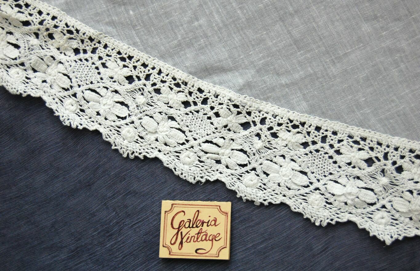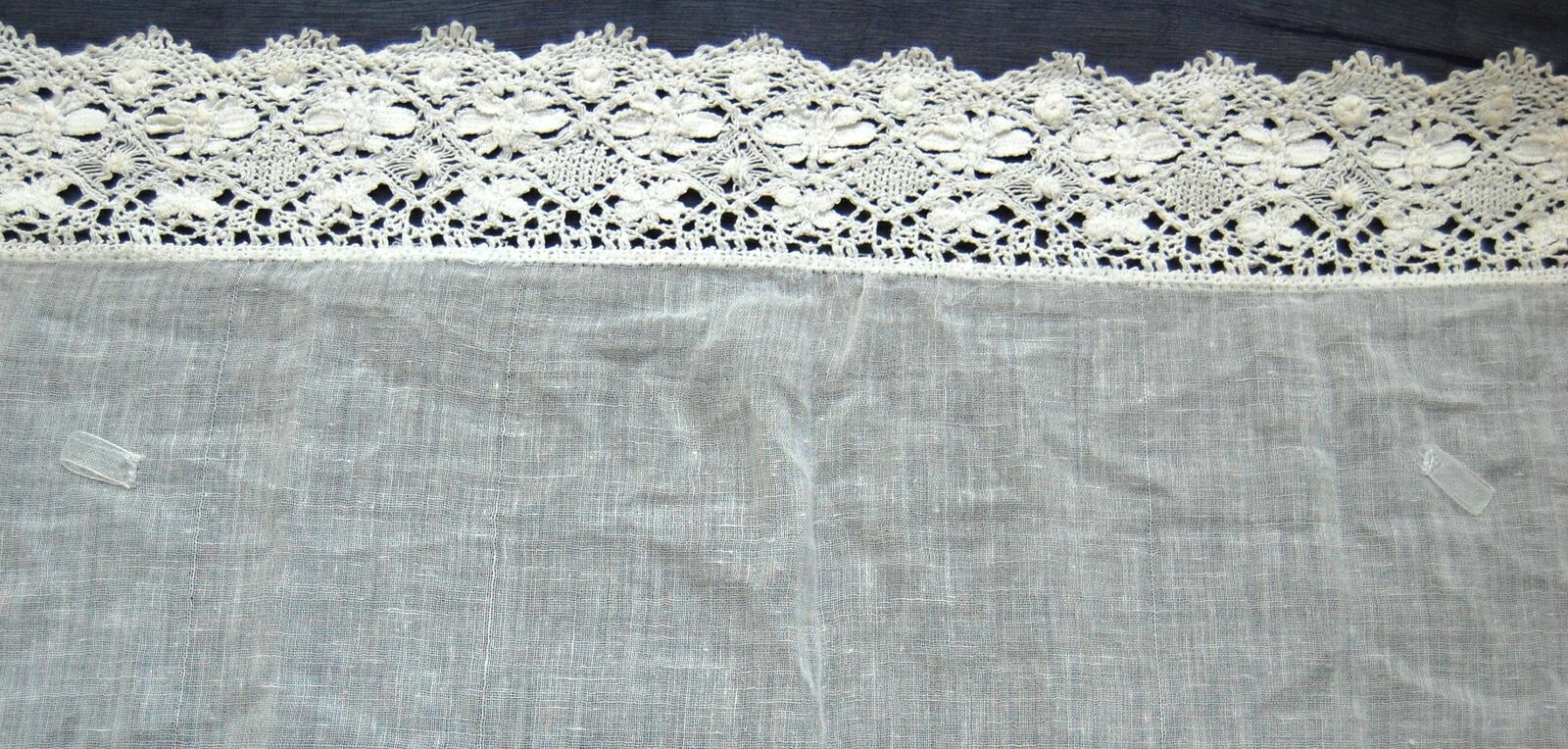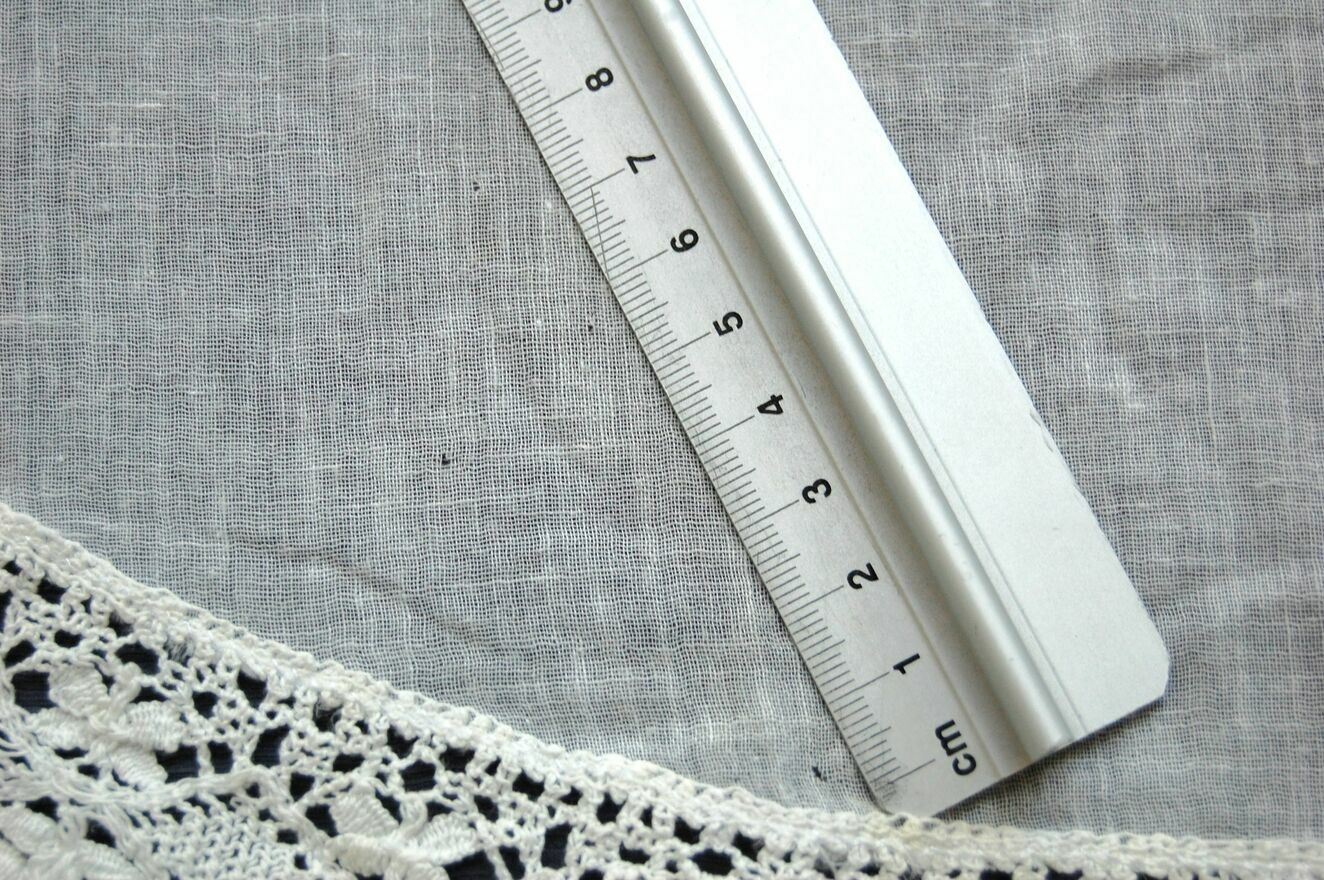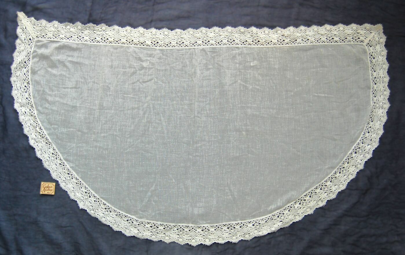 Mantylka - tradycyjne, damskie nakrycie głowy na Mszę Świętą: nieodłączny element godnego ubioru kobiecego. Chusta jest ręcznie uszyta z niezwykle delikatnej, półprzezroczystej bawełny w kolorze ecru. Jasny kolor mantylki jest przeznaczony dla panien, mężatki noszą ciemne barwy. Brzeg mantylki jest obszyty bawełnianą koronką. od spodu są dwa uchwyty na spinki, którymi można upiąć mantylkę, wykonane z półprzezroczystej wstążki. Chusta po założeniu na głowę okrywa też ramiona. Jest lekka, przewiewna. Stan zachowania bardzo dobry. W dwóch miejscach: w pobliżu jednego rogu i przy dolnej, półokrągłej krawędzi jest po kilka maleńkich dziurek (pokazane na zdjęciach ze zbliżeniem), prawdopodobnie dzieło moli. Materiał nie pruje się.Wymiary: