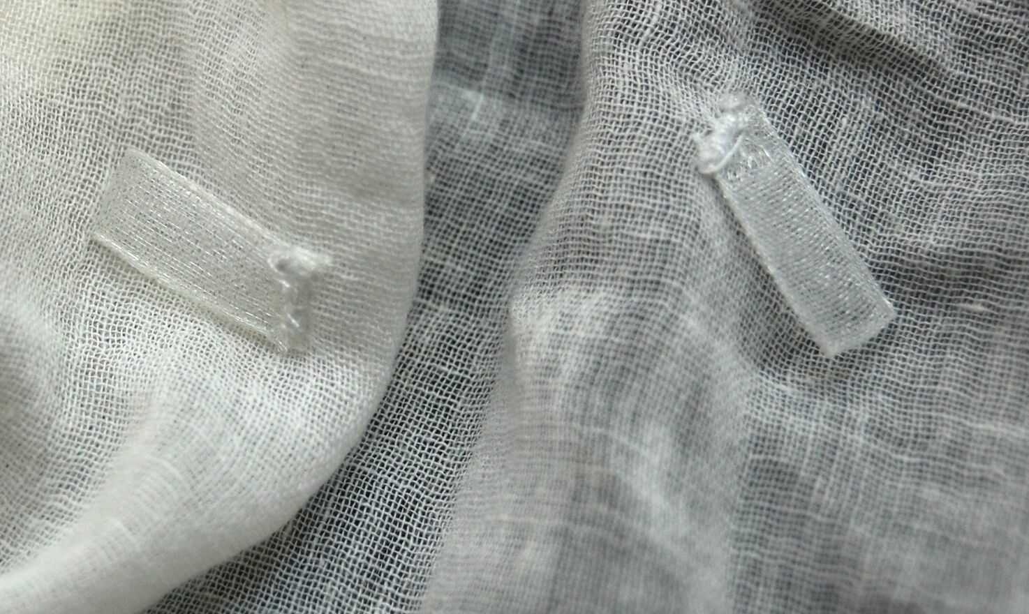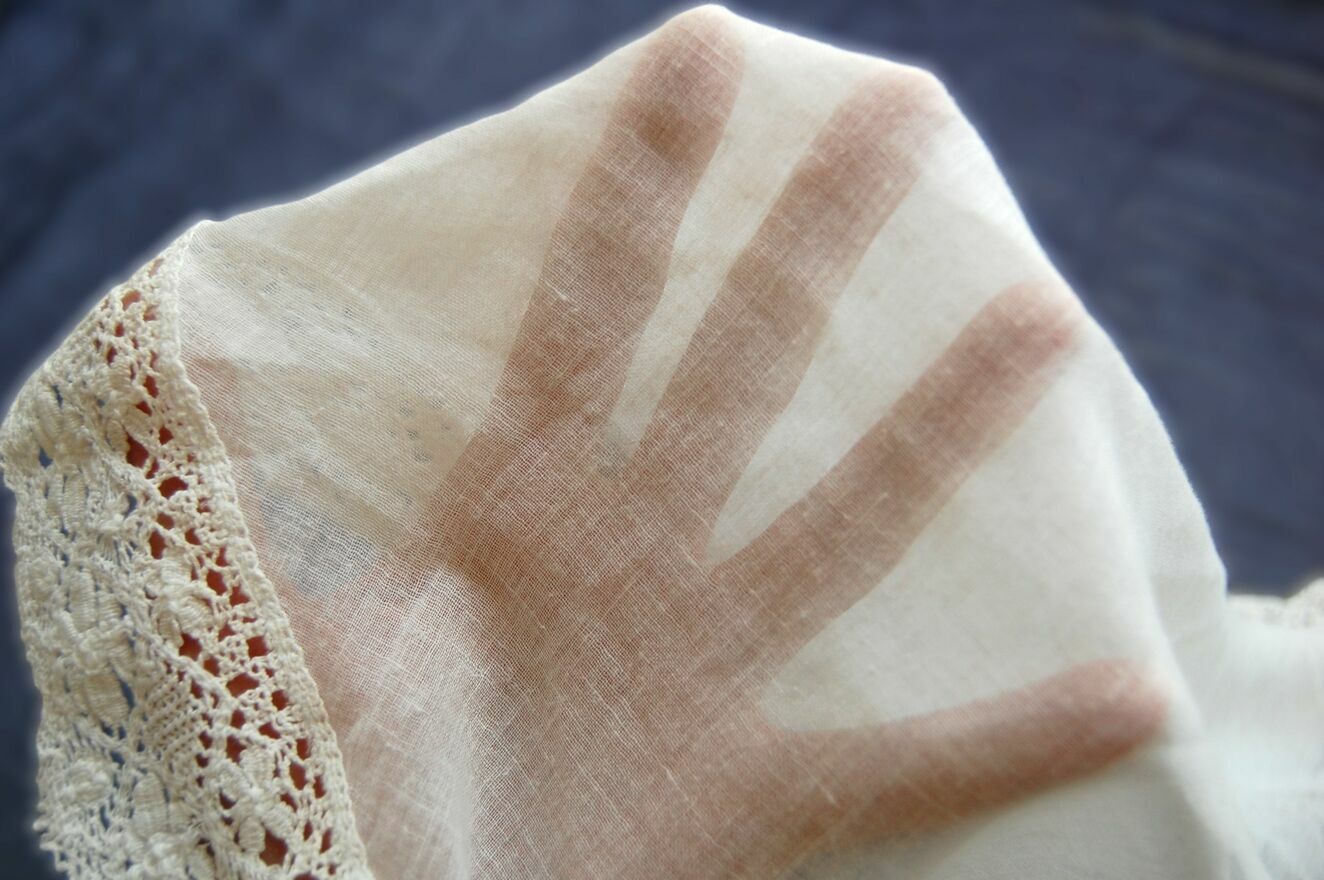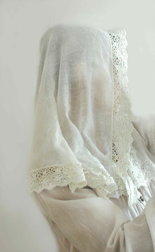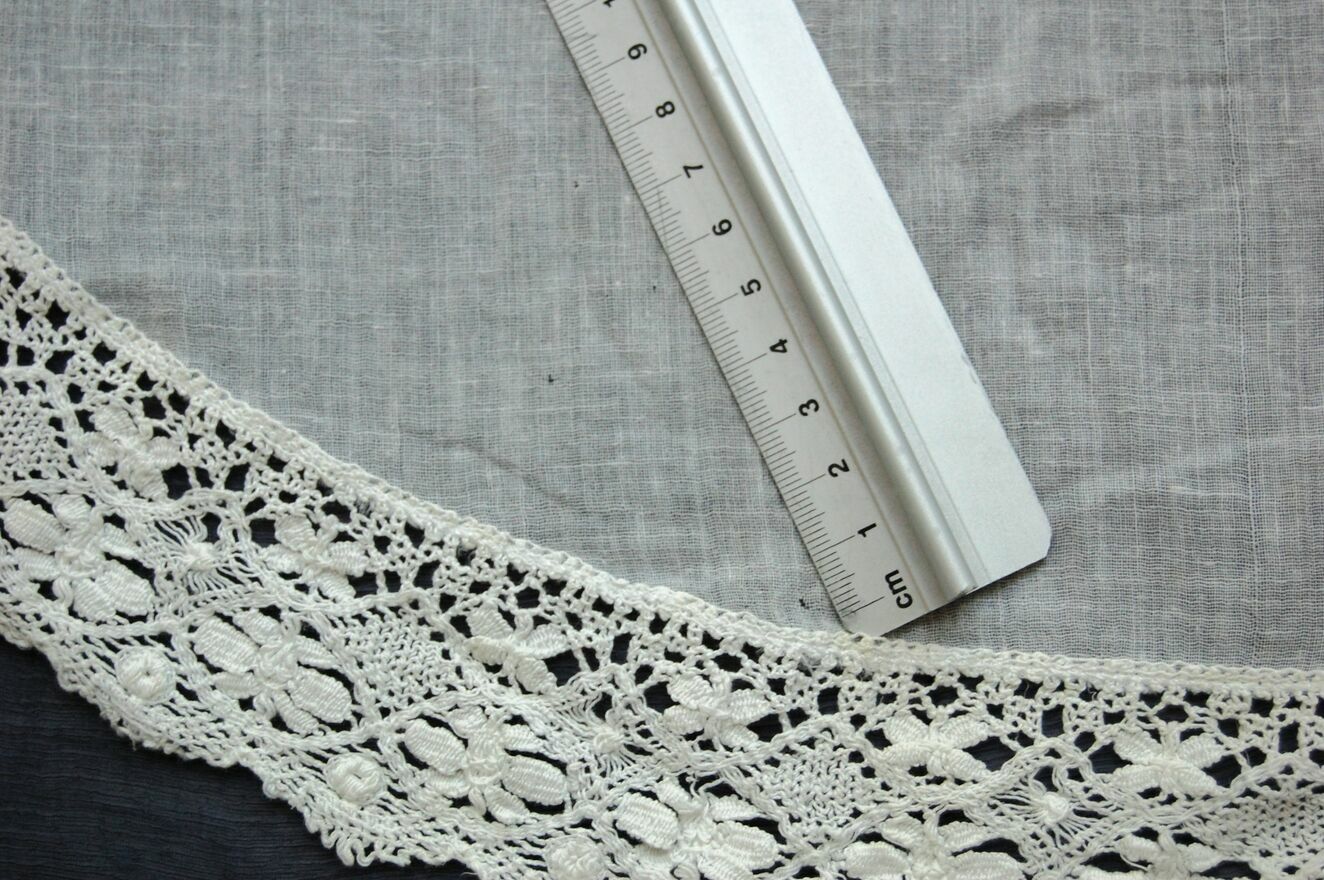 Mantylka - tradycyjne, damskie nakrycie głowy na Mszę Świętą: nieodłączny element godnego ubioru kobiecego. Chusta jest ręcznie uszyta z niezwykle delikatnej, półprzezroczystej bawełny w kolorze ecru. Jasny kolor mantylki jest przeznaczony dla panien, mężatki noszą ciemne barwy. Brzeg mantylki jest obszyty bawełnianą koronką. od spodu są dwa uchwyty na spinki, którymi można upiąć mantylkę, wykonane z półprzezroczystej wstążki. Chusta po założeniu na głowę okrywa też ramiona. Jest lekka, przewiewna. Stan zachowania bardzo dobry. W dwóch miejscach: w pobliżu jednego rogu i przy dolnej, półokrągłej krawędzi jest po kilka maleńkich dziurek (pokazane na zdjęciach ze zbliżeniem), prawdopodobnie dzieło moli. Materiał nie pruje się.Wymiary: