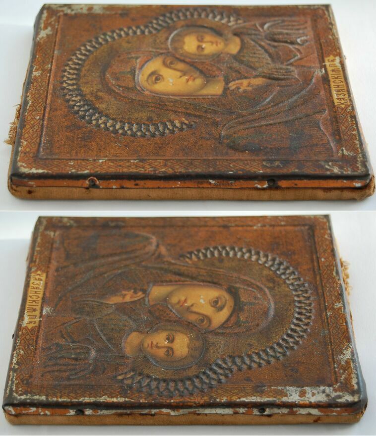 Zabytkowa, rosyjska ikona Matki Bożej Kazańskiej. Datowanie: 1800-1900 r. Ikona jest wykonana techniką nadruku na metalowej koszulce przybitej do deseczki. Z tyłu deska jest pokryta płótnem. Wizerunek jest pociemniały, miejscami przetarty. Dominują odcienie brązu i złota. Płótno ma przebarwienia.Wymiary (wysokość x szerokość x grubość): 13,5 x 11 x 1,3 cm.