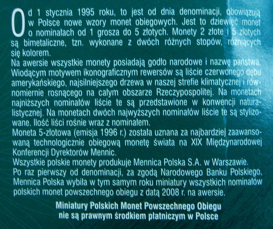 Unikatowy, rocznikowy zestaw miniatur polskich monet powszechnego obiegu. Premiera zestawu miała miejsce 8 lutego 2008 r.Zestaw zawiera komplet monet obiegowych z 2008 roku (od 1 grosza do 5 złotych) pomniejszonych do 2/3 wielkości w stosunku do oryginału. Monety zostały wybite w nakładzie 20 000 kompletów.