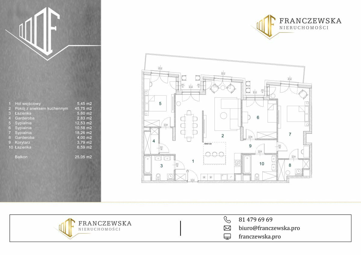 - Salon z aneksem kuchennym: 45,75 m2