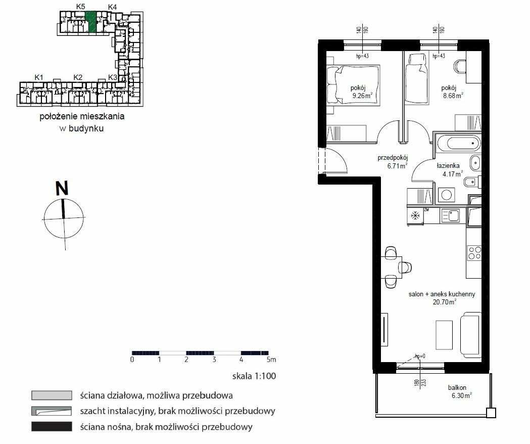 Trzypokojowe mieszkanie o powierzchni projektowej 49,52 m2 na 5 piętrze w 7 piętrowym bloku na Czechowie.Opis mieszkania: