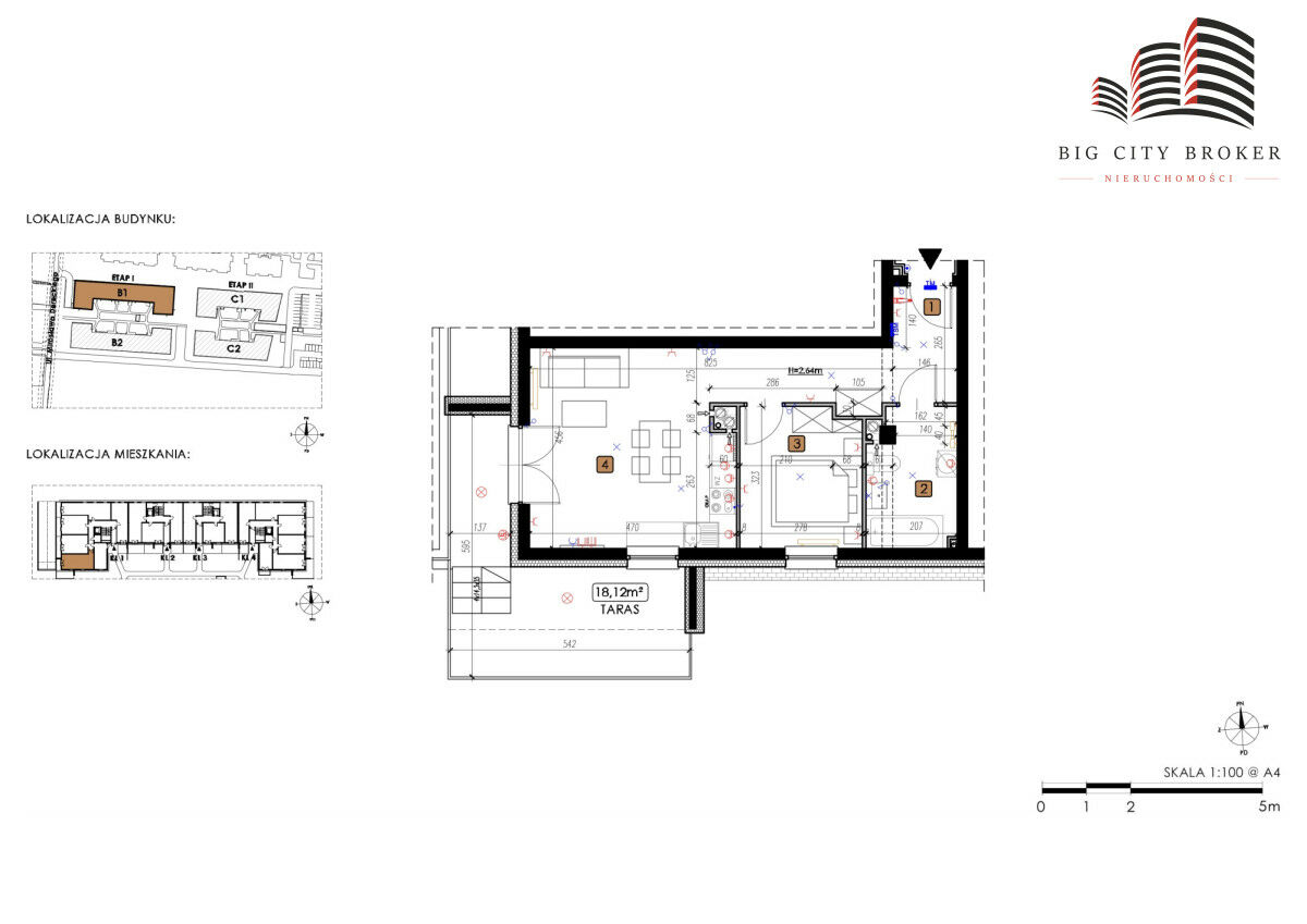 Powierzchnia użytkowa wynosi 43,57 m², w skład której wchodzi pokój z aneksem kuchennym, sypialnia, łazienka i przedpokój. Do mieszkania przynależy również ponad 18-metrowy taras.