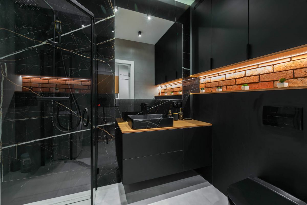W łazience prysznic, umywalka, pralka oraz szafa- pawlacz w zabudowie.
