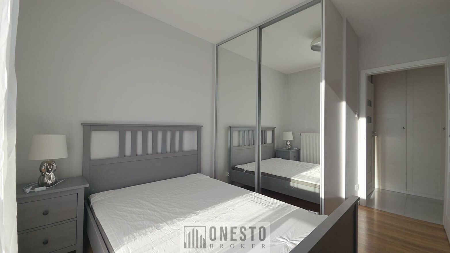 Sypialnia zapewnia wygodę i prywatność, wyposażona jest w duże, komfortowe łóżko oraz pojemną szafę, zapewniającą dużo miejsca do przechowywania.