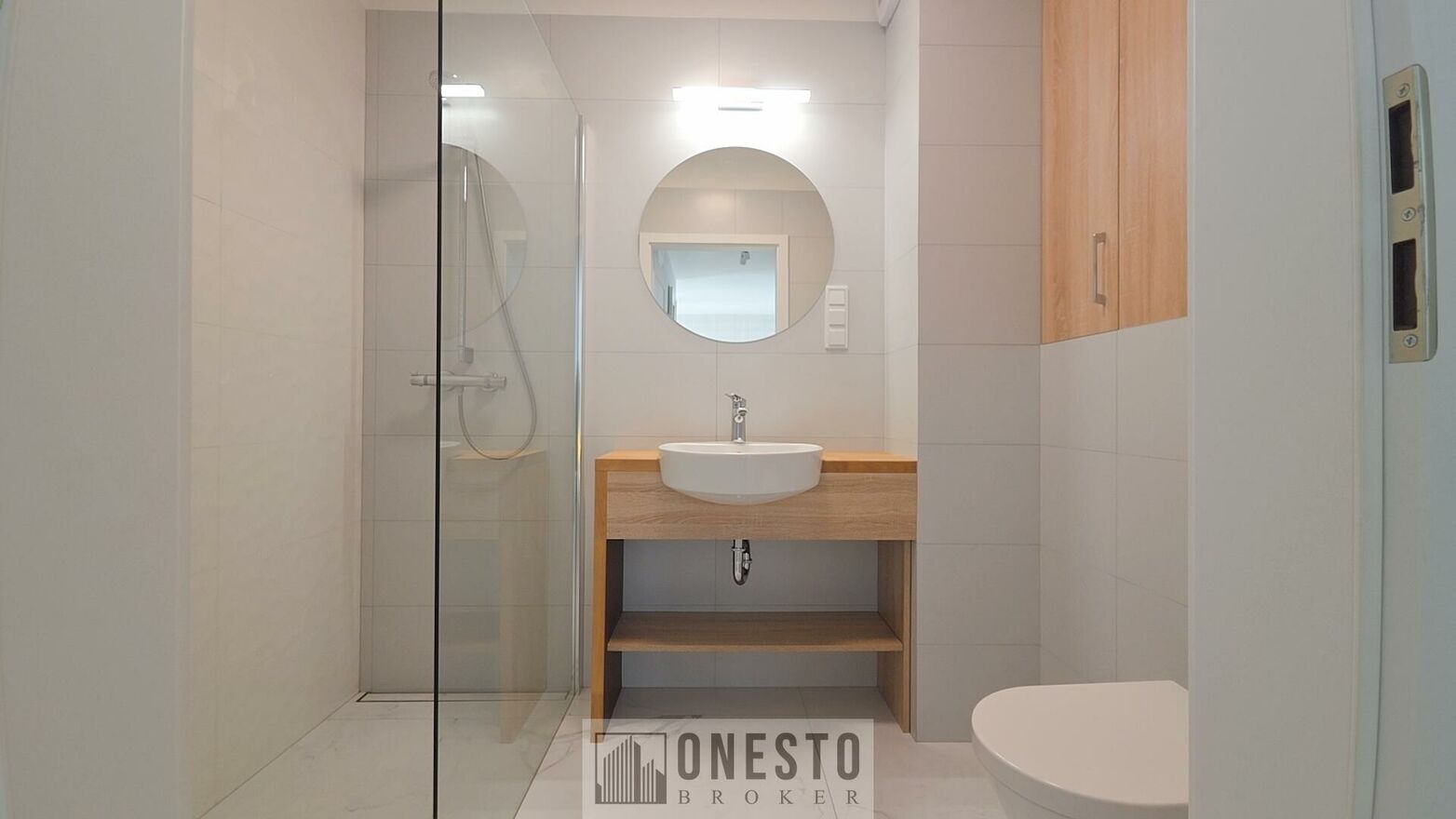 Łazienka z WC jest nowoczesna i funkcjonalna, z prysznicem oraz praktycznymi szafkami.
