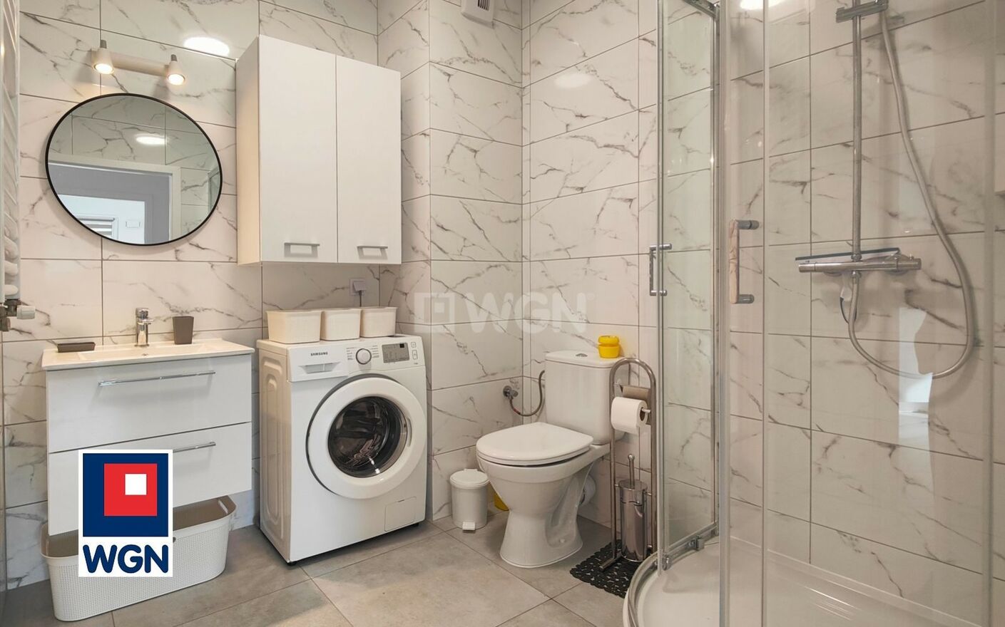 Łazienka wyposażona w prysznic, szafkę łazienkową oraz pralkę.