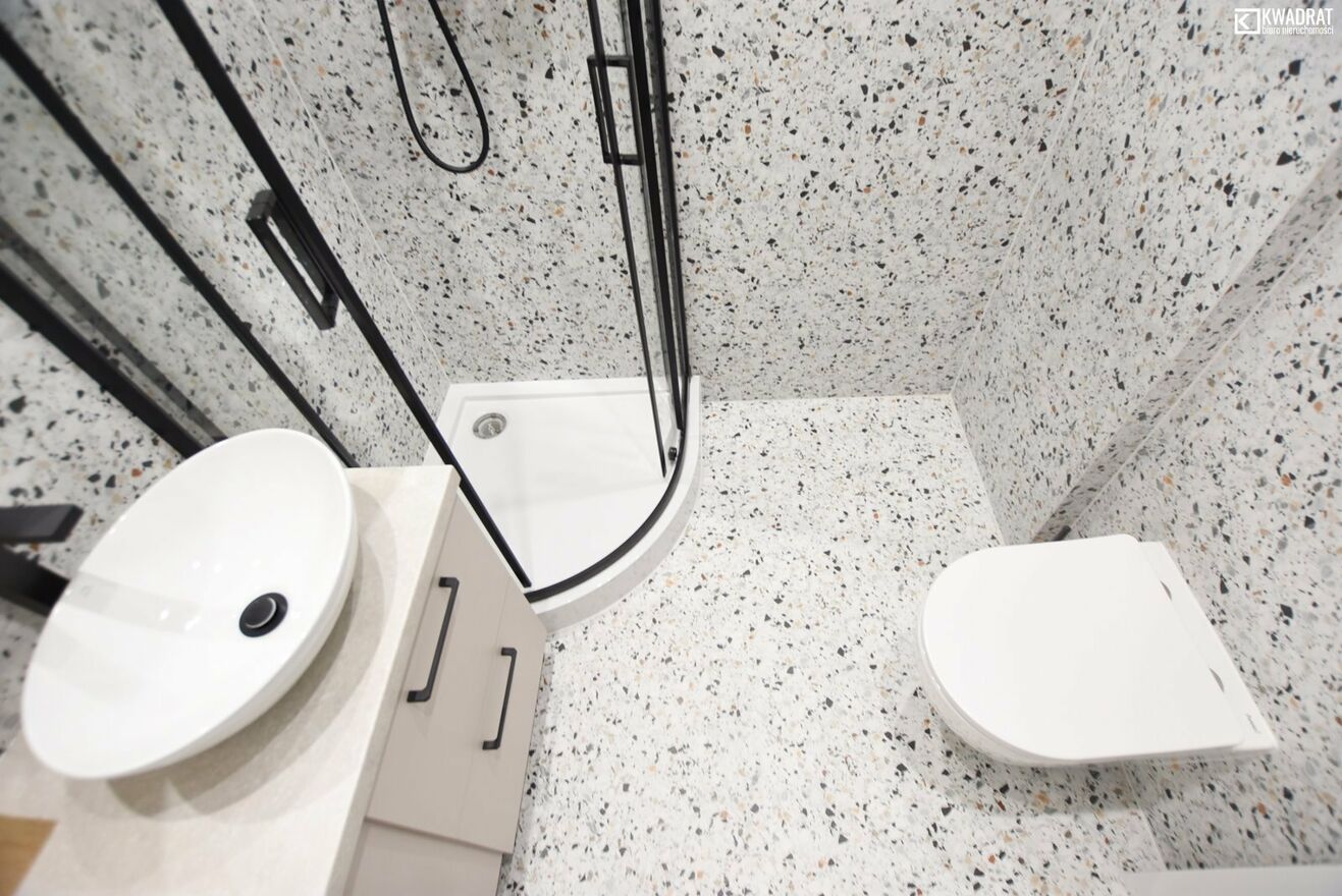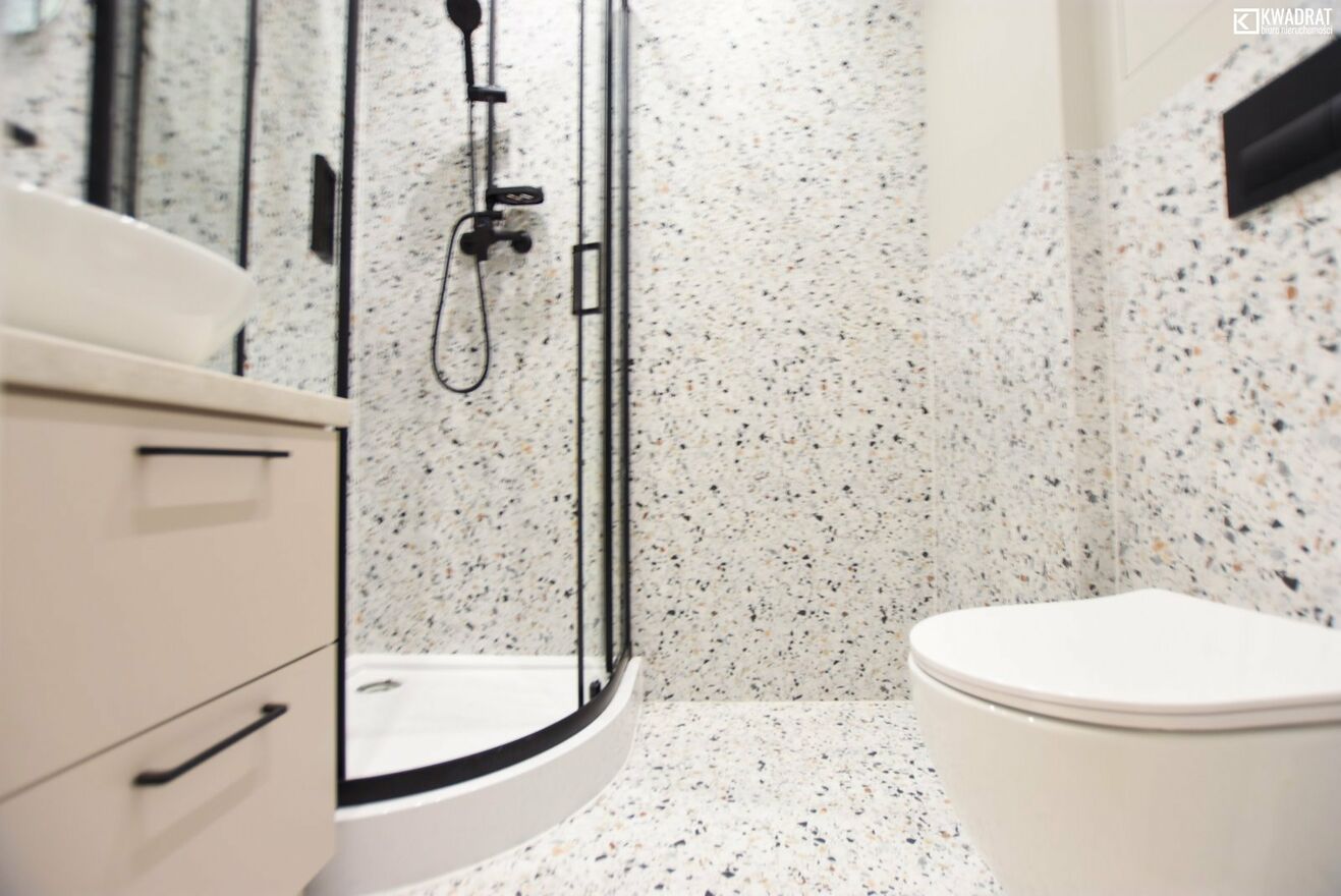 Wysokiej jakości panele podłogowe, w łazience gres na podłodze i ścianie,