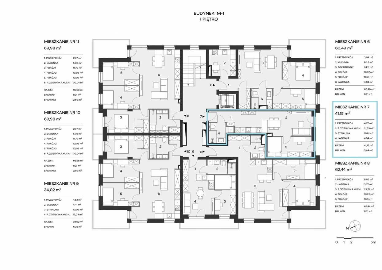Oznaczenie mieszkania nr 7 w budynku M-1, lokalizacja w budynku wraz z rozkładem pomieszczeń ukazana w galerii zdjęć.