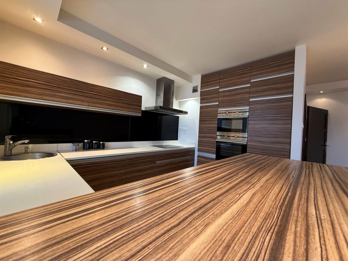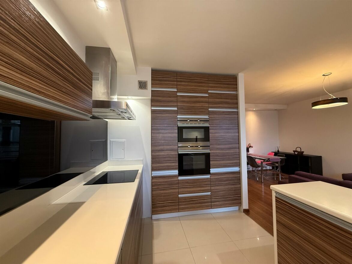 Kuchnia w zabudowie wykonanej na indywidualne zamówienie, z praktycznymi rozwiązaniami, dużo miejsca do przechowywania. Szerokie szuflady, szafki cargo, szafki obrotowe, zamontowane podchwyty. Na ścianie praktyczny lacobel. Wysokiej jakości sprzęt AGD firmy Teka pozostaje w cenie mieszkania.