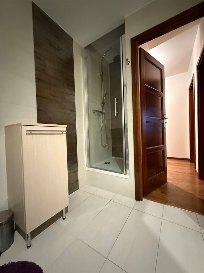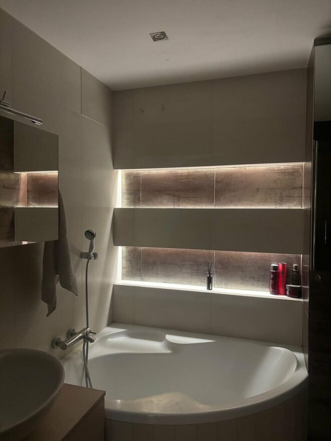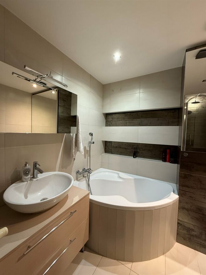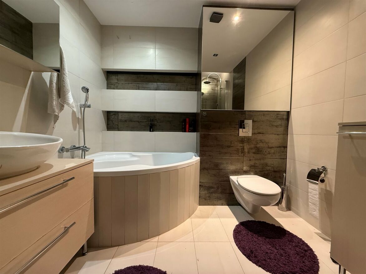 W przestronnej łazience znajduje się zarówno narożna wanna jak i kabina prysznicowa. Wysokiej jakości glazura i terakota. Ogromne lustra powiększają przestrzeń i pełnią funkcję szafek do przechowywania. Umywalka nablatowa z szafką z pojemnymi szufladami. Sufit podwieszany, oświetlenie halogenowe. Dodatkowo dekoracyjne półki nad wanną z oświetleniem ledowym.