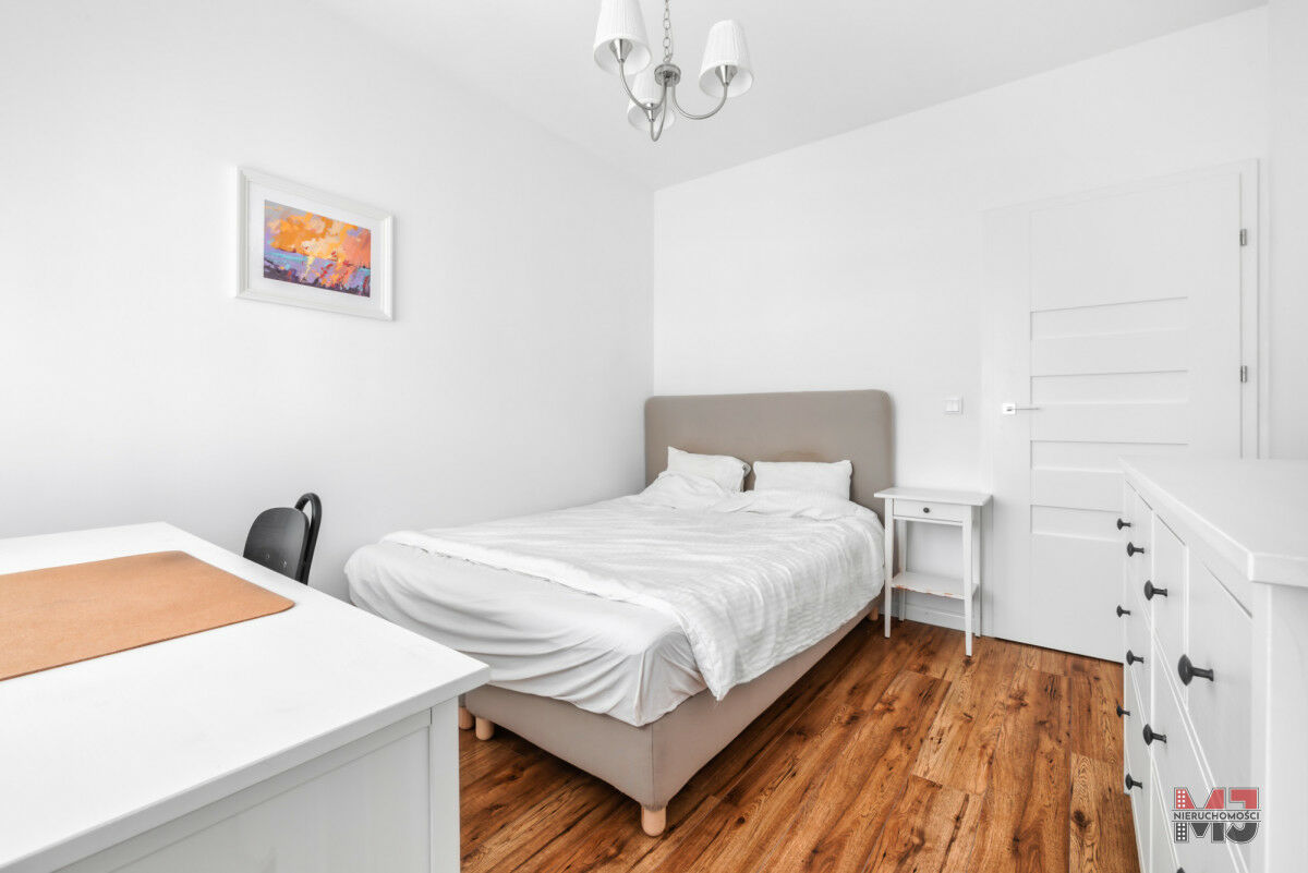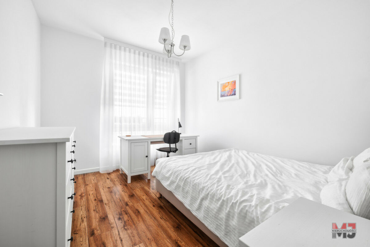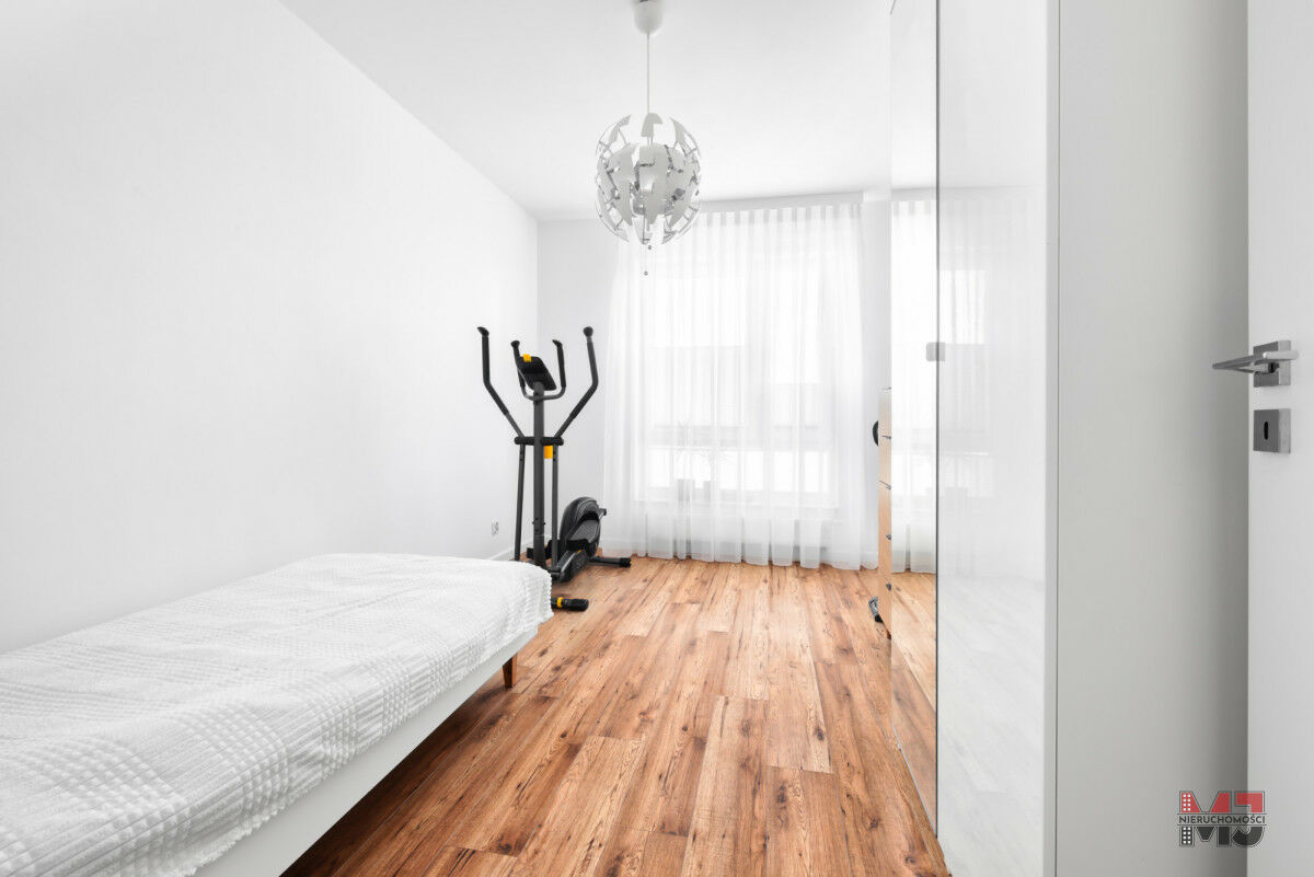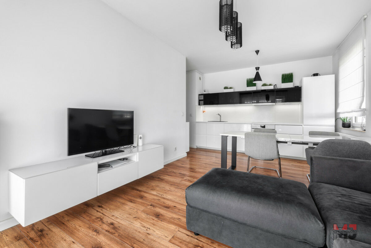 Wysoki standard wykończenia - drewniane panele, jasne ściany i nowoczesna kuchnia z pełnym wyposażeniem sprawiają, że mieszkanie jest eleganckie i przytulne.