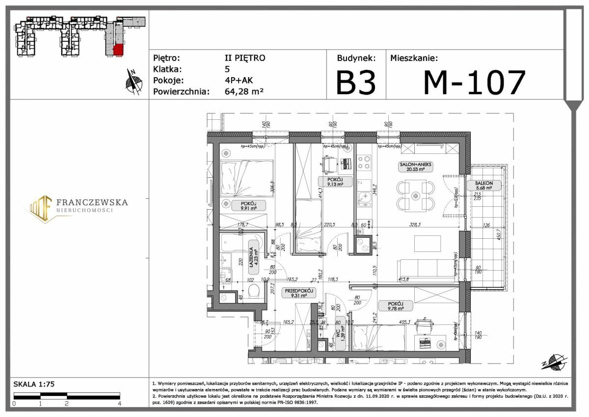 Trzypokojowe mieszkanie o powierzchni projektowej 64,28 m2 położone na drugim piętrze w budynku z wystawą okien na południe i wschód.Na nieruchomość składają się: