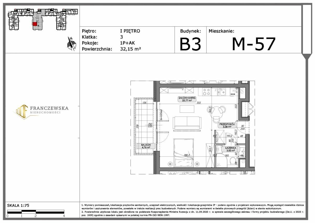 Mieszkanie o powierzchni 32,15 m2 położone na pierwszym piętrze w budynku z wystawą okien południowy wschódNa nieruchomość składają się: