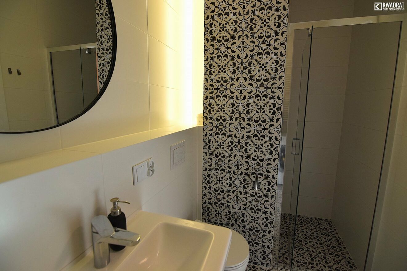 - W łazience mamy do dyspozycji prysznic z odpływem liniowym,