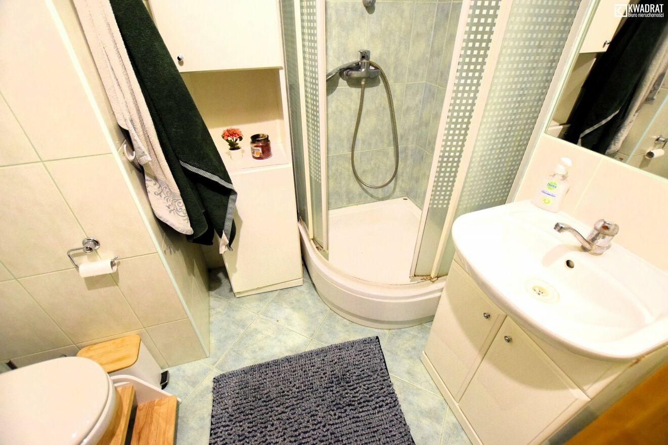 łazienka po remoncie wyposażona w kabinę prysznicową z toaletą i umywalkę.