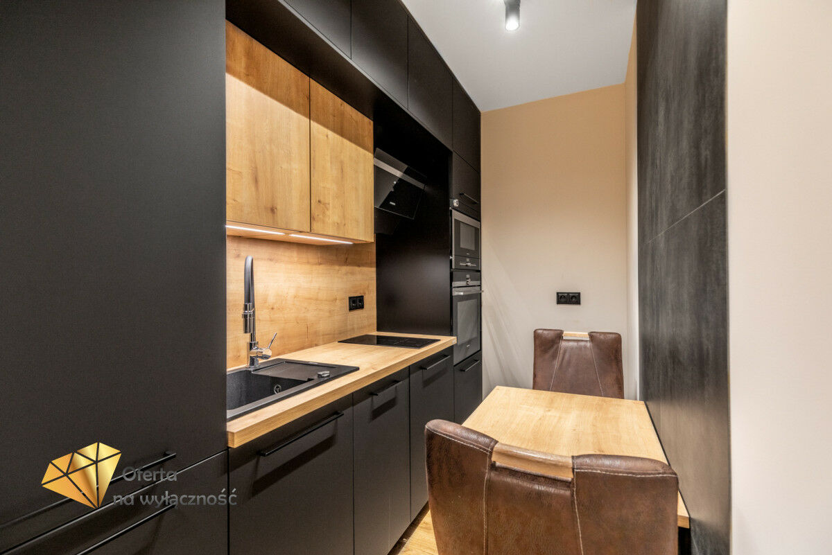 aneks kuchenny - zabudowa z AGD (piekarnik z mikrofalą, płyta, zmywarka, okap, lodówka z zamrażarką, stolik, 2 krzesła, zastawa),