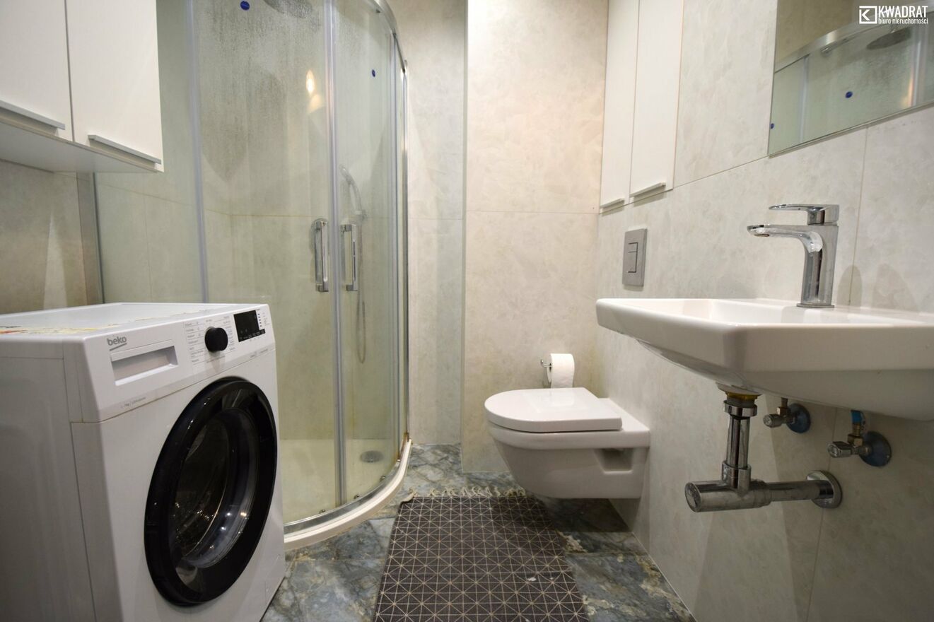 łazienka po remoncie wyposażona w kabinę prysznicową z toaletę i umywalkę.