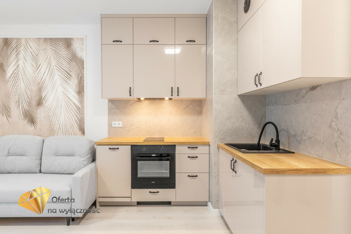 Kuchnia w pełni wyposażona: zmywarka, lodówka, płyta indukcyjna, okap, piekarnik.