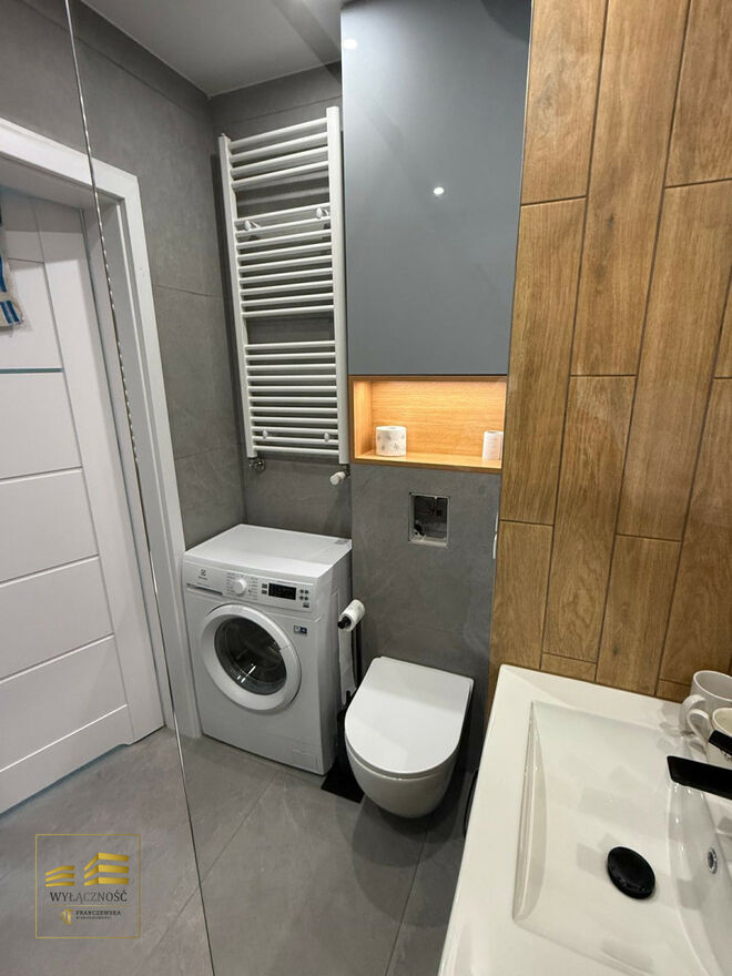 Łazienka. z kabiną prysznicową, pralką, umywalką i wc.