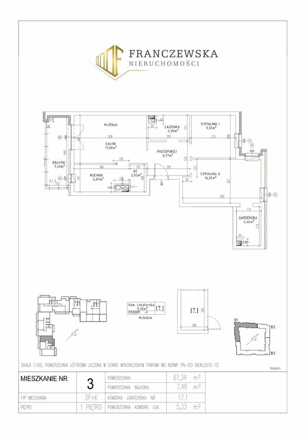 Dwustronne, trzypokojowe mieszkanie o powierzchni projektowej 67,34 m2 z wystawą okien na północny-wschód i południowy-zachód.Zestawienie powierzchni: