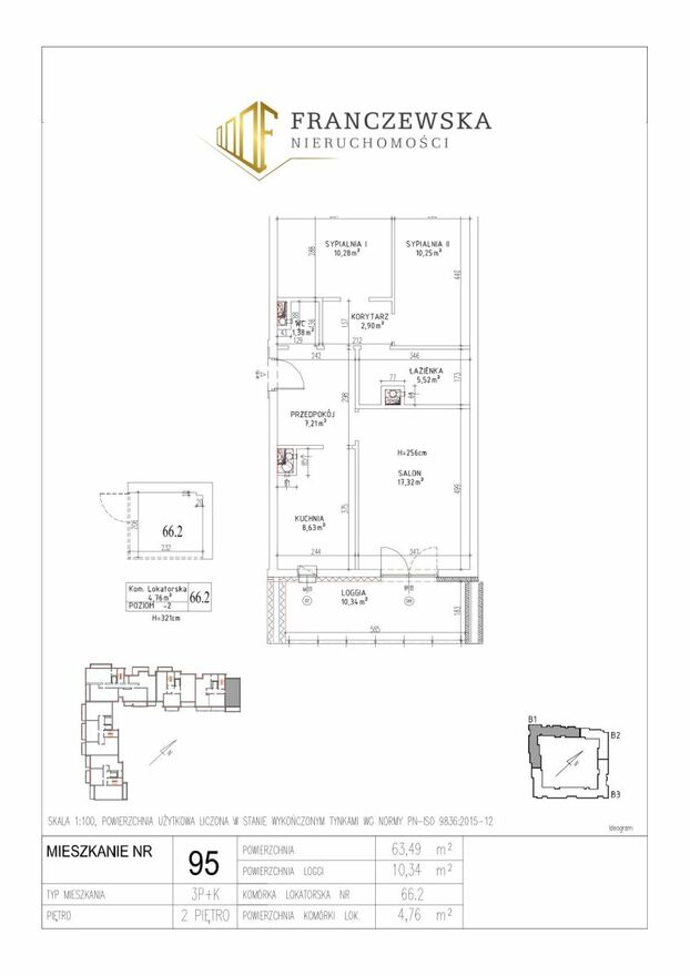Trzypokojowe mieszkanie o powierzchni projektowej 63,49 m2 z wystawą okien na północny-zachód i południowy-wschódZestawienie powierzchni: