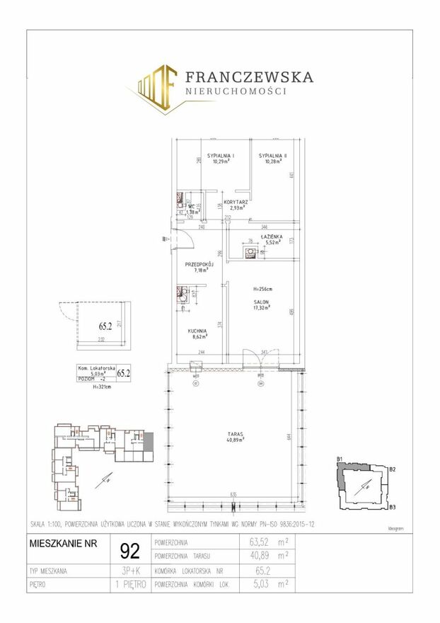 Trzypokojowe mieszkanie o powierzchni projektowej 63,23 m2 z wystawą okien na północny-zachód i południowy-wschódZestawienie powierzchni:
