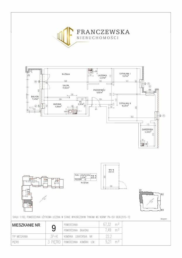 Dwustronne, trzypokojowe mieszkanie o powierzchni projektowej 67,32 m2 z wystawą okien na północny-wschód i południowy-zachód.Zestawienie powierzchni: