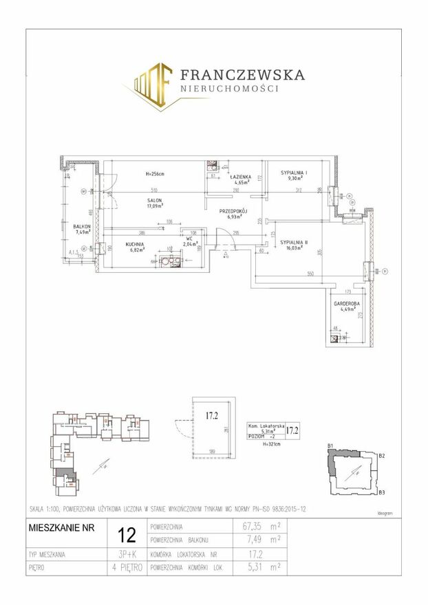 - Pokój dzienny o pow. 17,09 m2 z wyjściem na balkon o pow. 7,49 m2