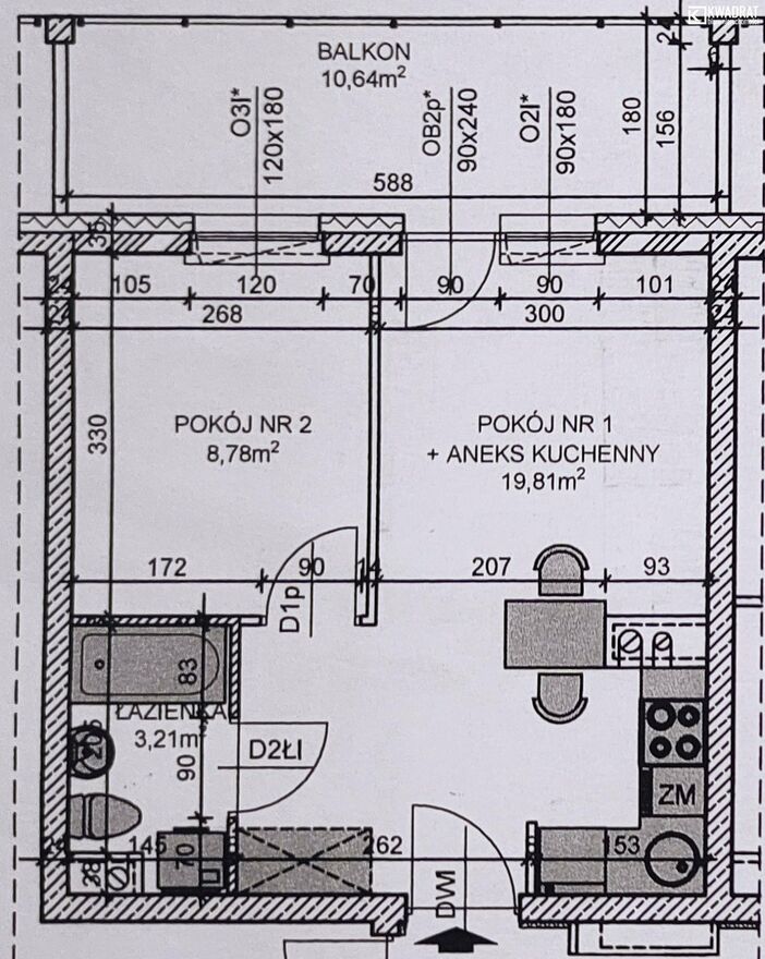 Powierzchnie: mieszkanie mierzy ok. 32 m2 i znajduje się na parterze nowego bloku; na powierzchnię składają się: salon z aneksem kuchennym o pow. 19,81m2, sypialnia o pow. 8,78 m2, łazienka z WC o pow. 3,21 m2, przy wejściu do mieszkania znajduje się pojemna szafa. Dodatkowo mieszkanie wyróżnia się balkonem o powierzchni 10,64 m2.