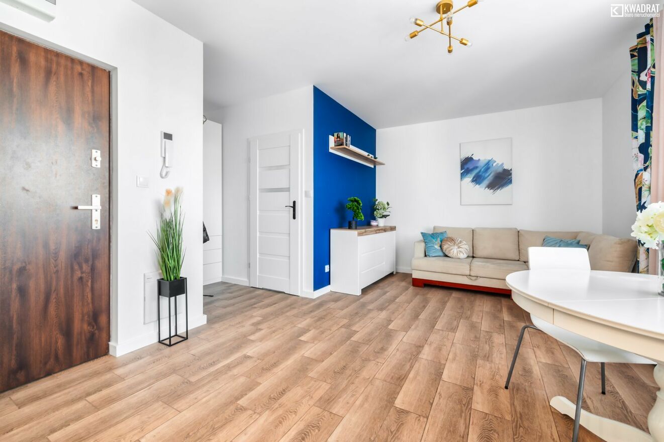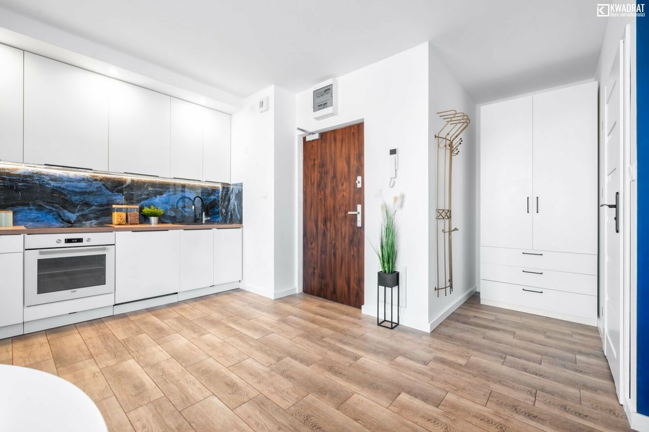 Powierzchnie: mieszkanie mierzy ok. 28 m2 i znajduje się na czwartym piętrze nowego bloku; na powierzchnię składają się: salon z aneksem kuchennym, łazienka z WC, przedpokój z pojemną szafą. Dodatkowo mieszkanie wyróżnia się balkonem o powierzchni 7,19 m2.